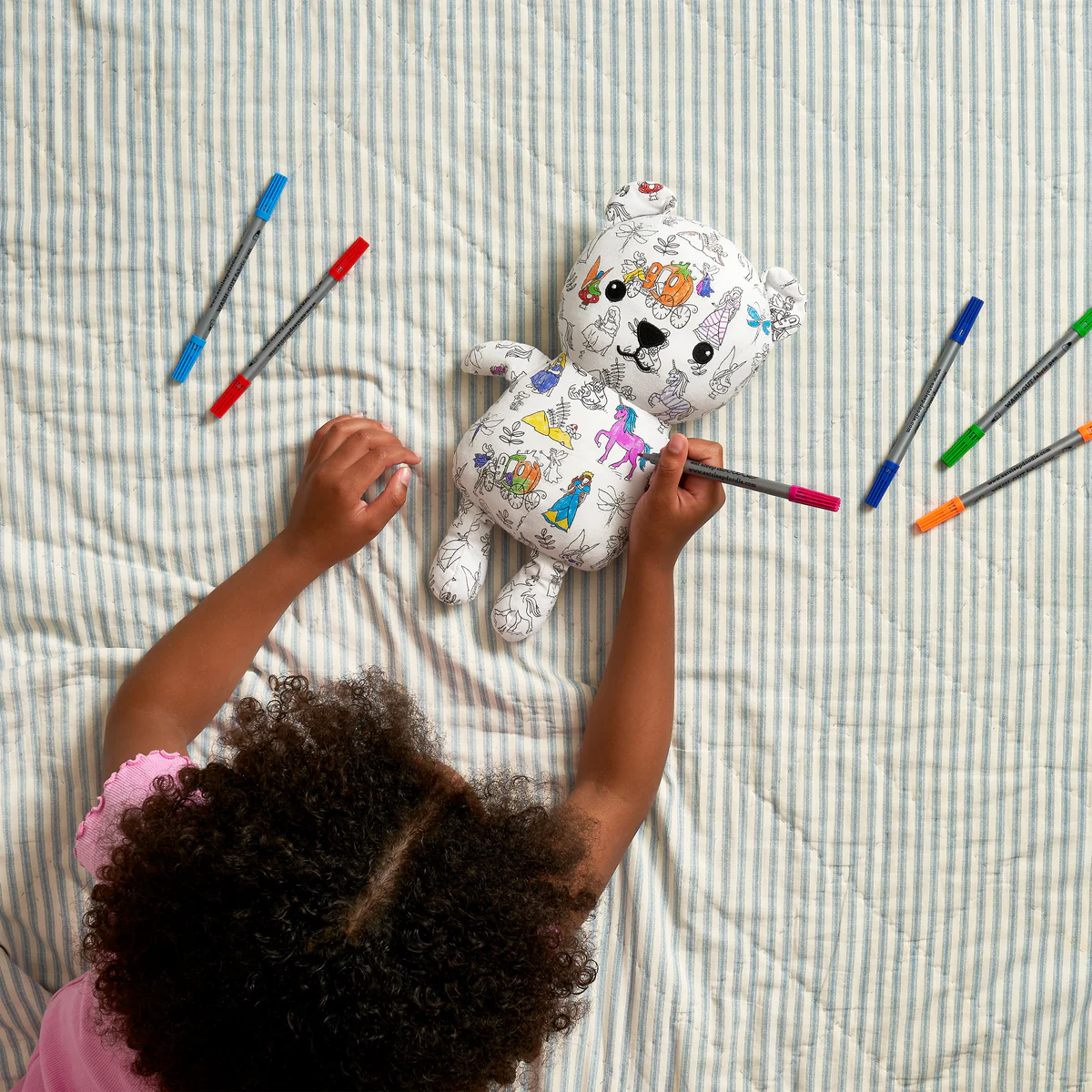 Meet Artie, the colour-in fairytale bear with a set of 10 double-ended doodle wash-out pens! This magical cuddly companion is ready for endless creativity—kids can colour in the enchanting design with the included wash-out pens, then wash and start again! Made from super-soft fabric, he’s perfect for snuggles and storytelling fun. Machine washable for repeated play. Dry naturally. Cotton and polyester fibre. Keep away from fire.