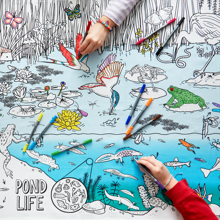 Discover the wonders of nature with our colour-in pond life tablecloth with a set of 10 double-ended doodle wash-out pens! Packed with fascinating wildlife, kids can colour, learn, and explore as they bring the scene to life. Simply wash and reuse for endless fun! Perfect for mealtimes, parties, or creative play.