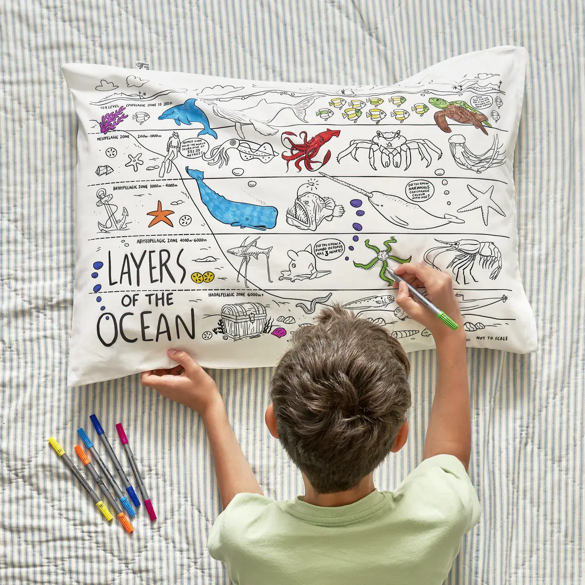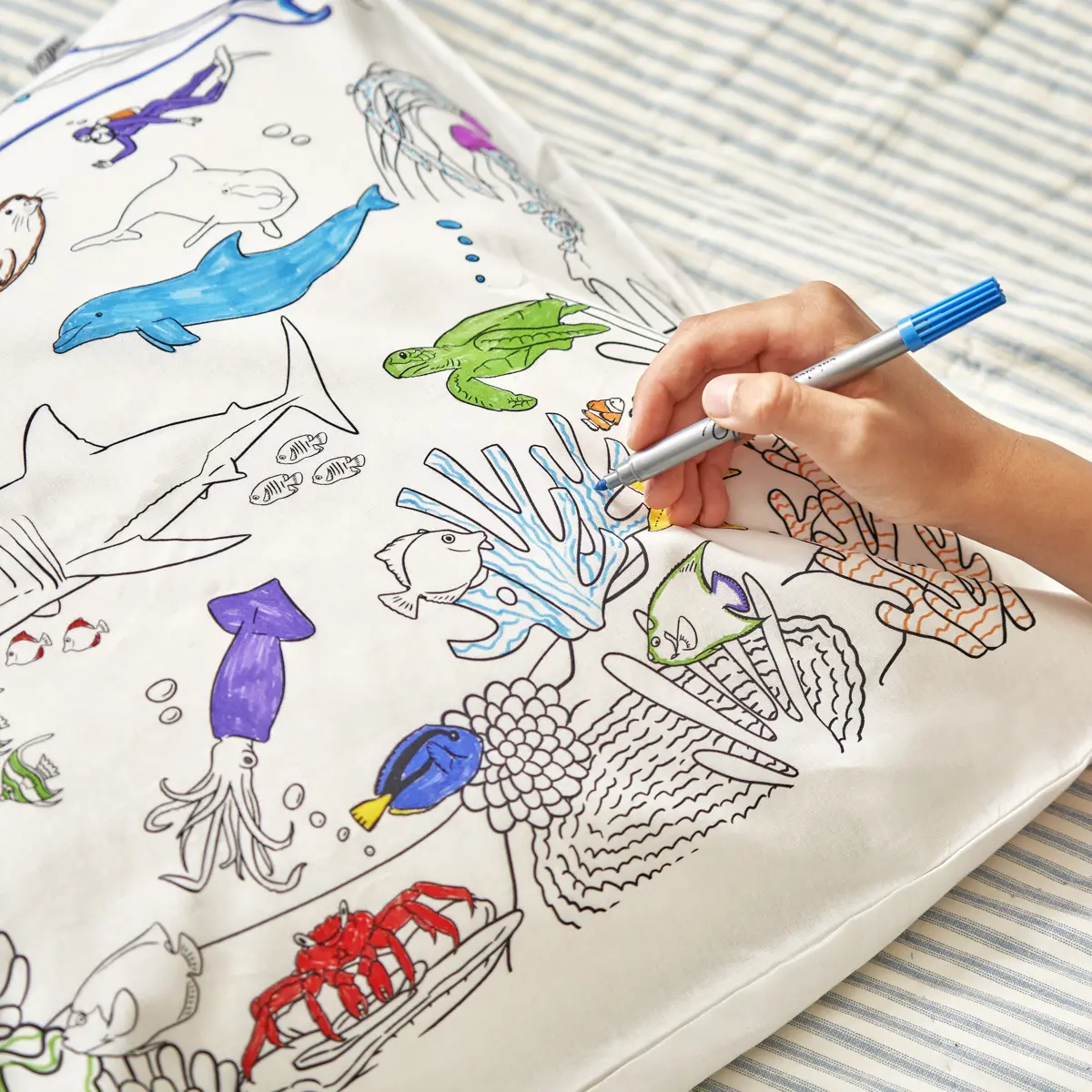 When your little one is ready for a new aquatic adventure, simply pop the pillowcase on a warm machine wash, the ink completely disappears, and it's ready for more under the sea colouring!