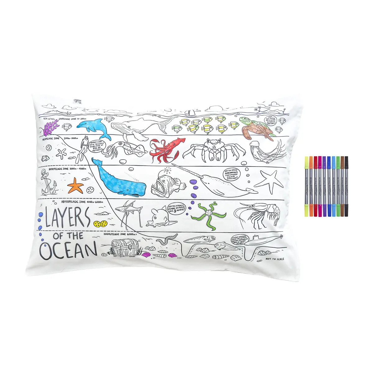 Dive deep under the sea with our fun cotton pillowcase to colour in packed with marvellous marine life and fin-tastic ocean facts for kids – complete with double-ended washable fabric pens!