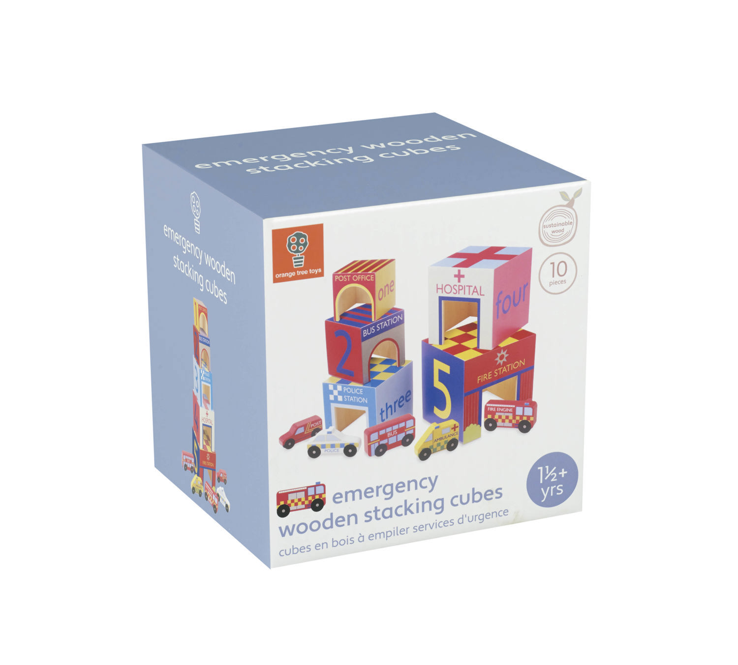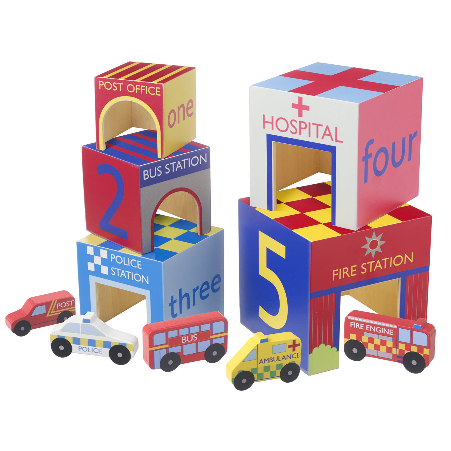 Each box is in the design of a different service building, and comes with a wooden vehicle, helping to encourage imaginative play.
