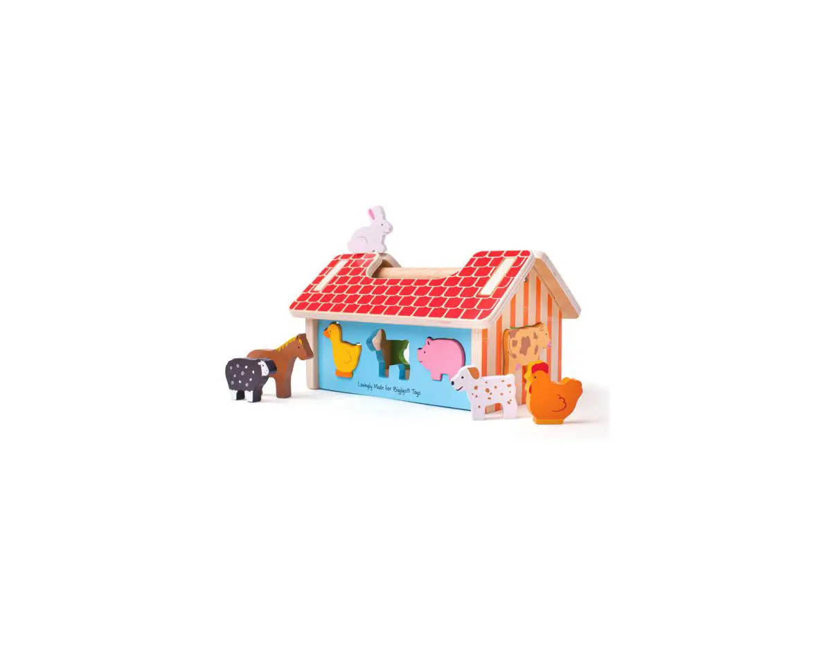 All the fun of the farm! Our lovely Farmhouse Shape Sorter vibrant farm animals and of course, the wooden farm. Tots will enjoy matching each animal to its uniquely shaped slot on the wall of the farmhouse. When all the animals are safely inside, the roof can be removed and the animals lifted or poured out for one more game! This Shape Sorter Toy is a great way to develop little one's dexterity and fine motor skills. The useful wooden carry handle makes this the ideal travel toy, too! Our Farmhouse Wooden Shape Sorter is crafted from premium-quality, responsibly sourced materials and coated with child-friendly paints and lacquers. Conforms to current European safety standards.