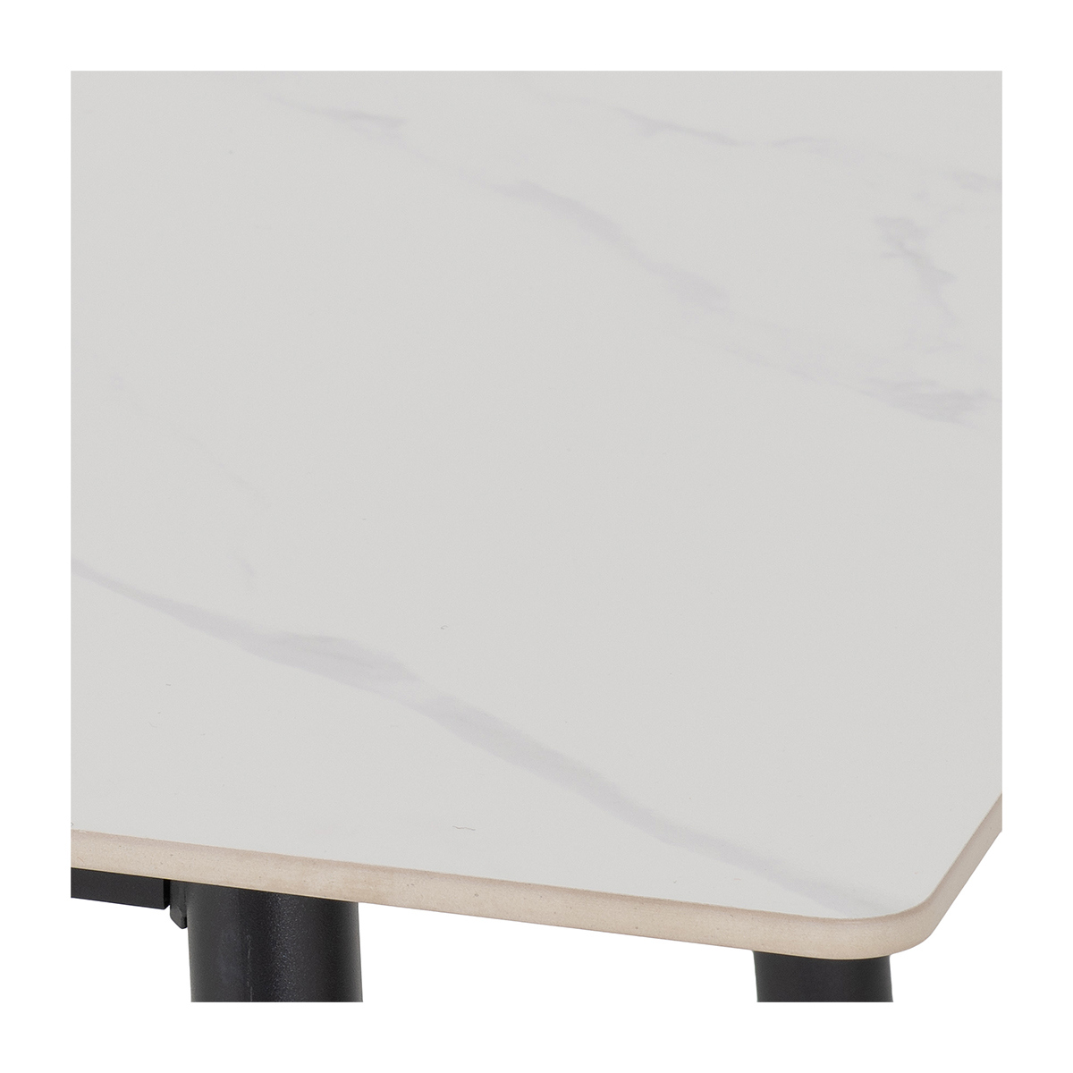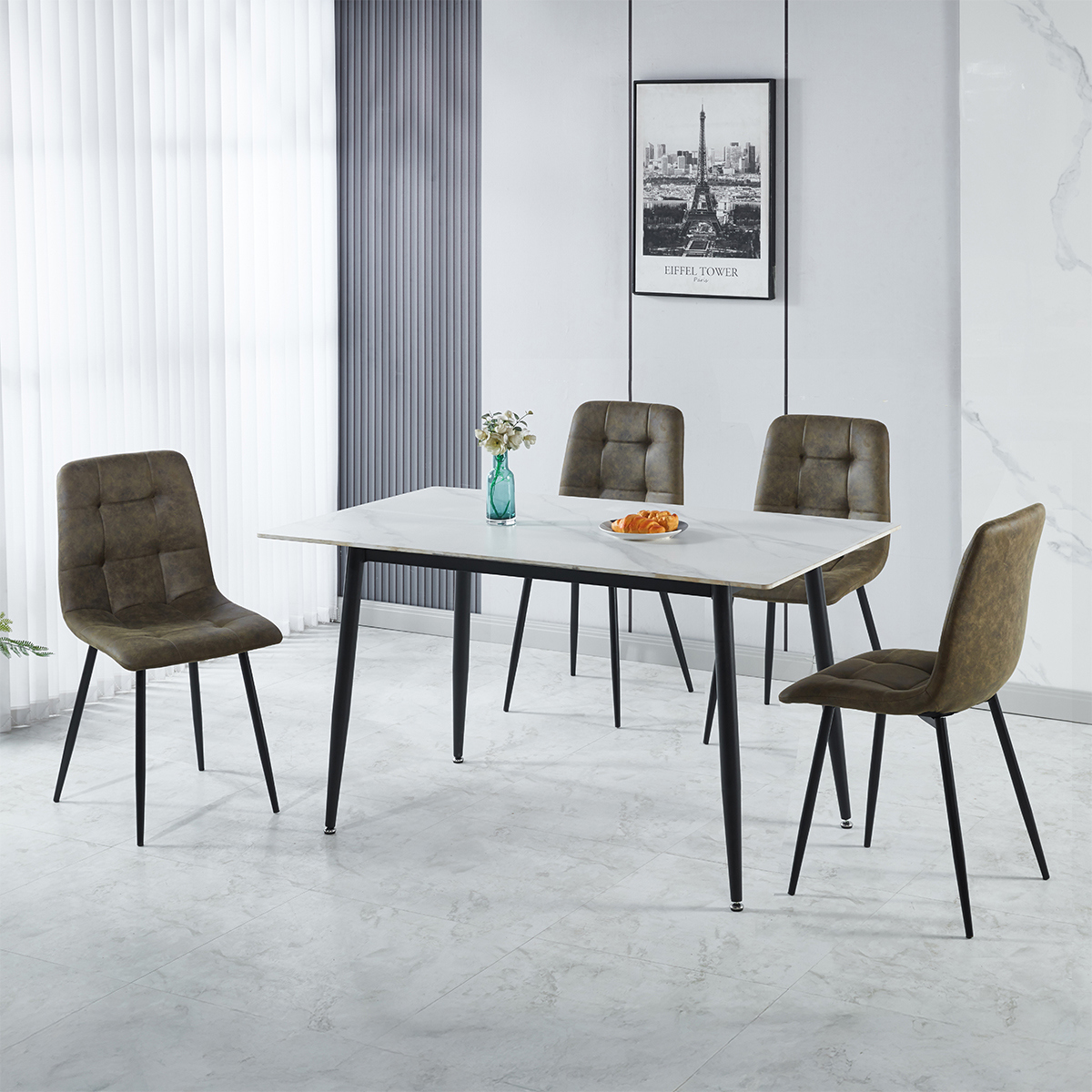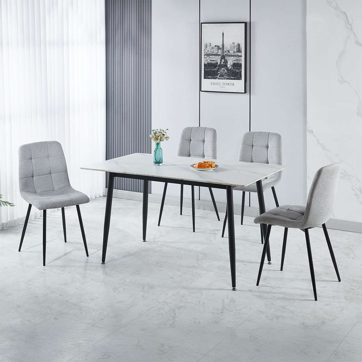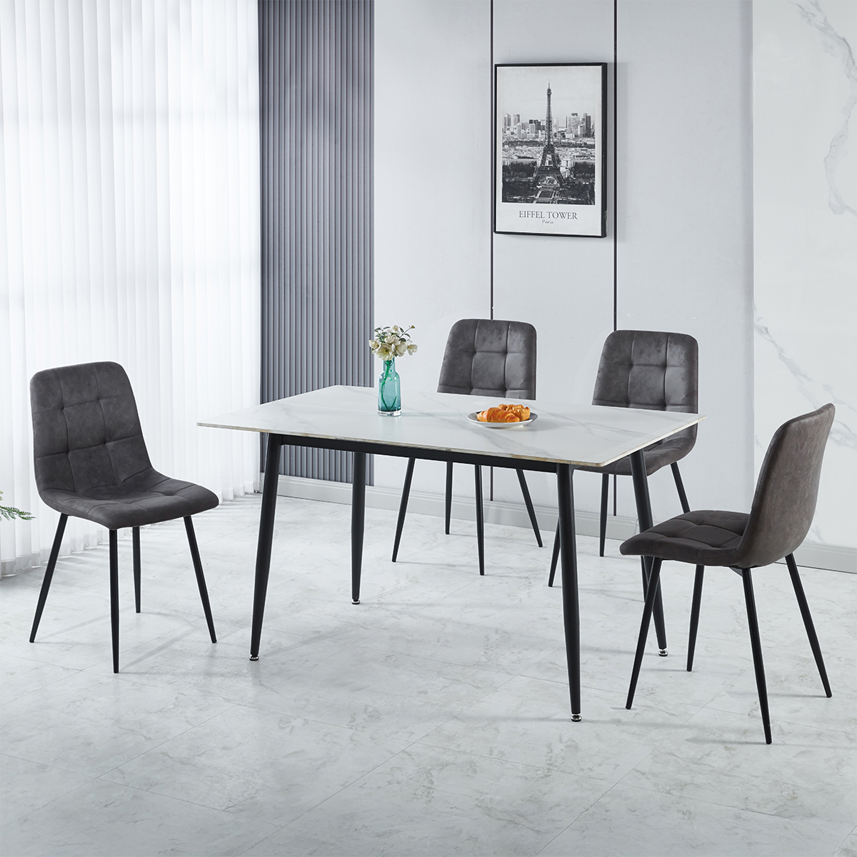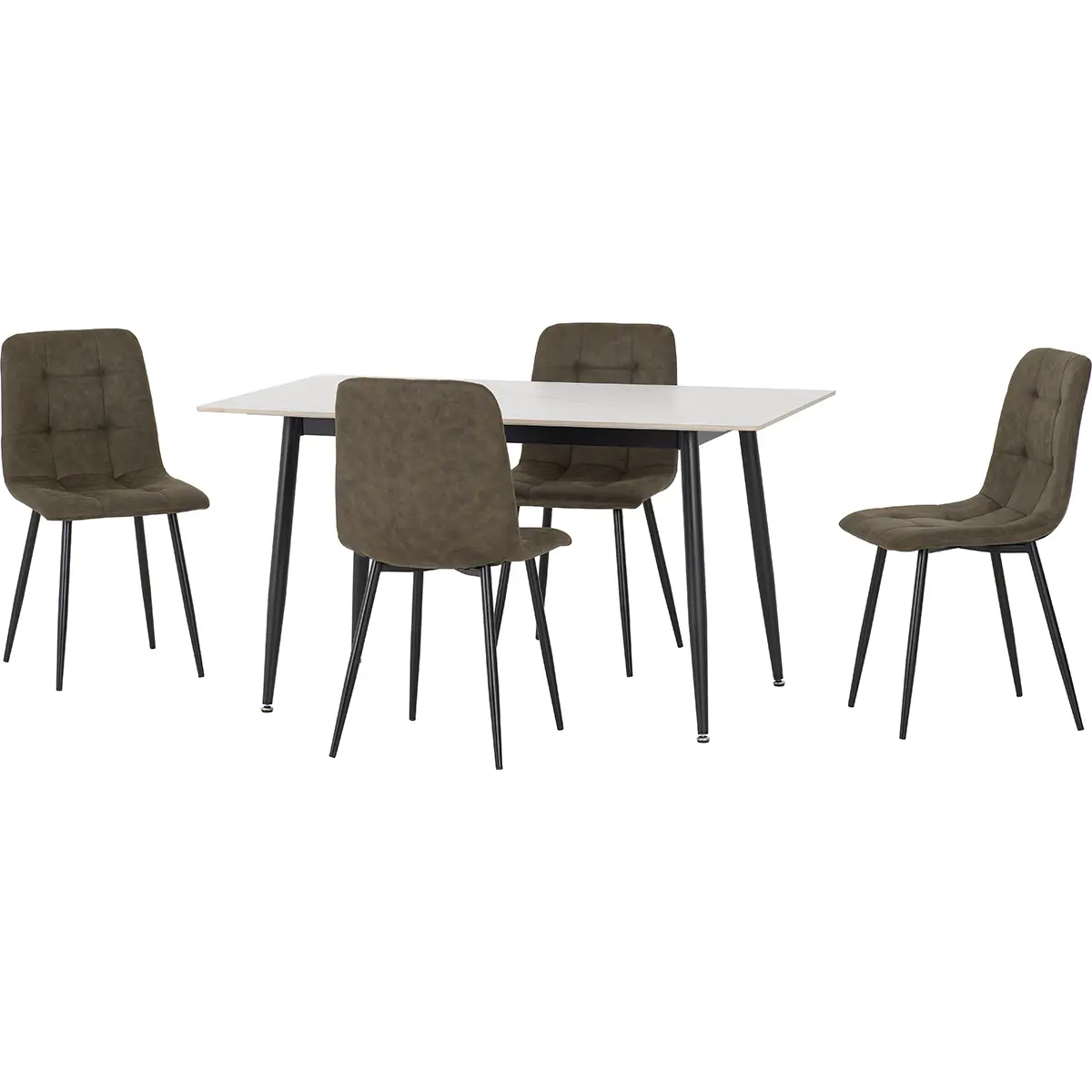 Contemporary Design: Sleek marble-effect tabletop paired with slim black metal legs for a modern look. Timeless Appeal: Marble-effect finish adds elegance that complements modern and minimalist décor. Set Includes: One dining table and four matching chairs for a complete dining solution. Ideal for Entertaining: Designed for both everyday meals and special occasions. Durable Construction: High-quality materials ensure strength and stability for everyday use.