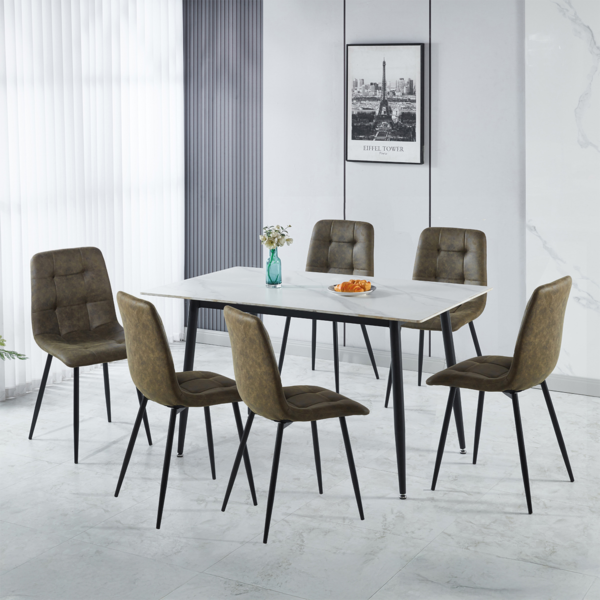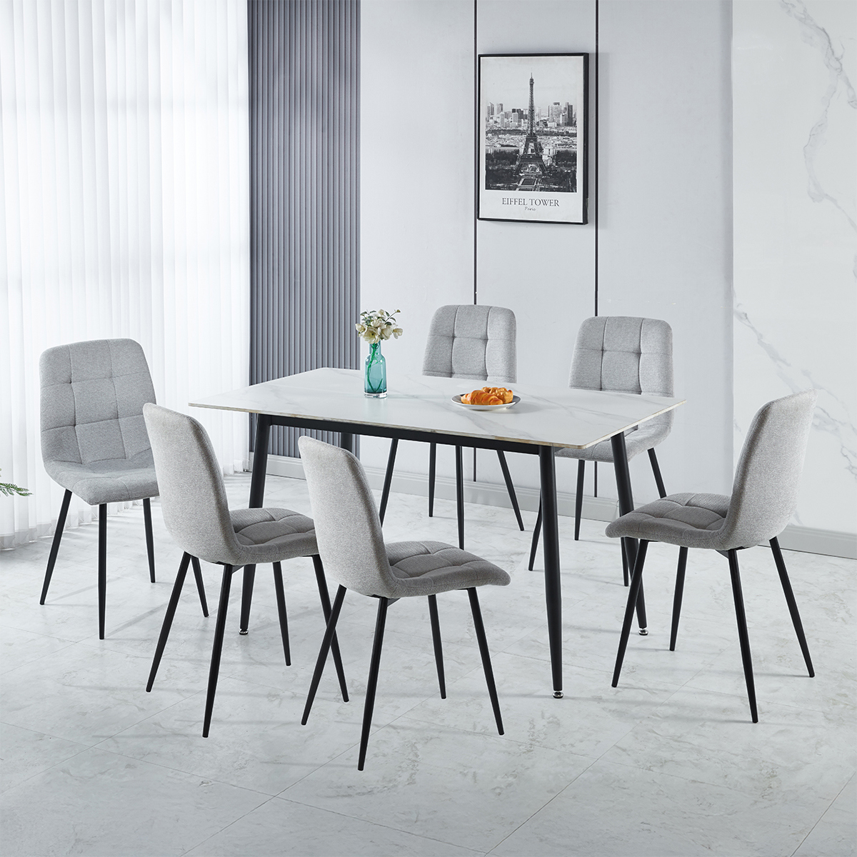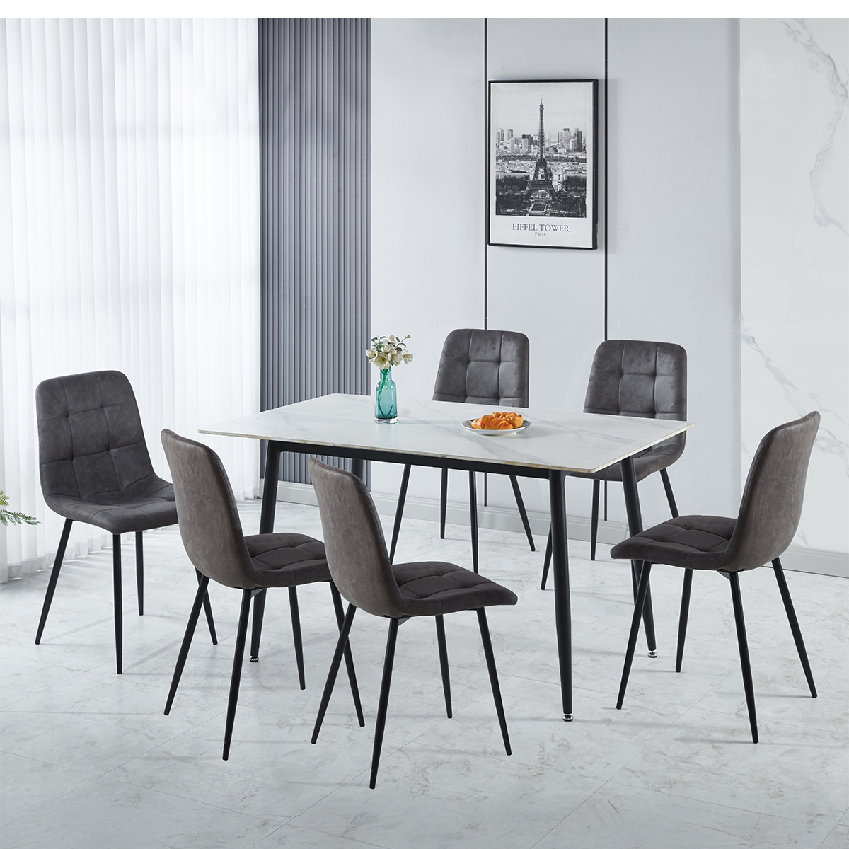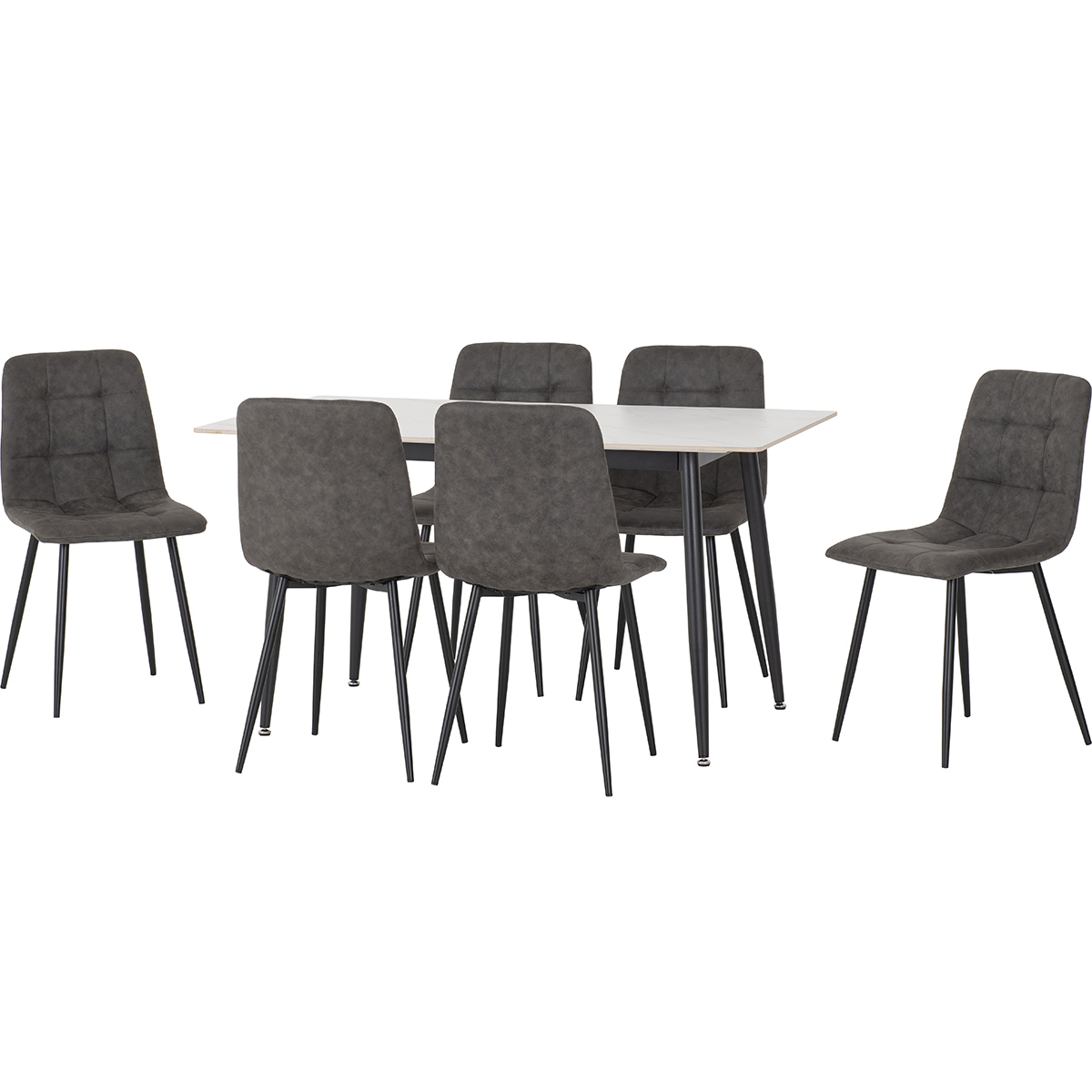 Contemporary Design: Sleek marble-effect tabletop paired with slim black metal legs for a modern look. Timeless Appeal: Marble-effect finish adds elegance that complements modern and minimalist décor. Set Includes: One dining table and six matching chairs for a complete dining solution. Ideal for Entertaining: Designed for both everyday meals and special occasions. Durable Construction: High-quality materials ensure strength and stability for everyday use.