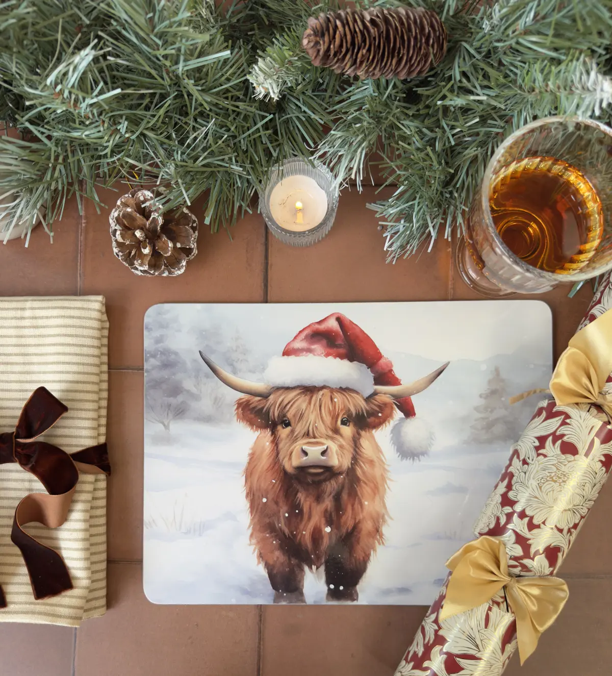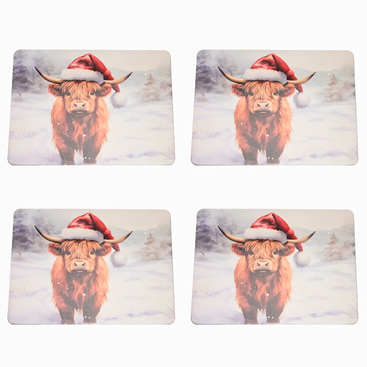 Enhance your Christmas table with our set of 4 Christmas Highland Cow placemats. These delightful placemats, featuring a festive Highland cow in a Santa hat amidst a snowy scene, bring rustic charm to any meal setting.