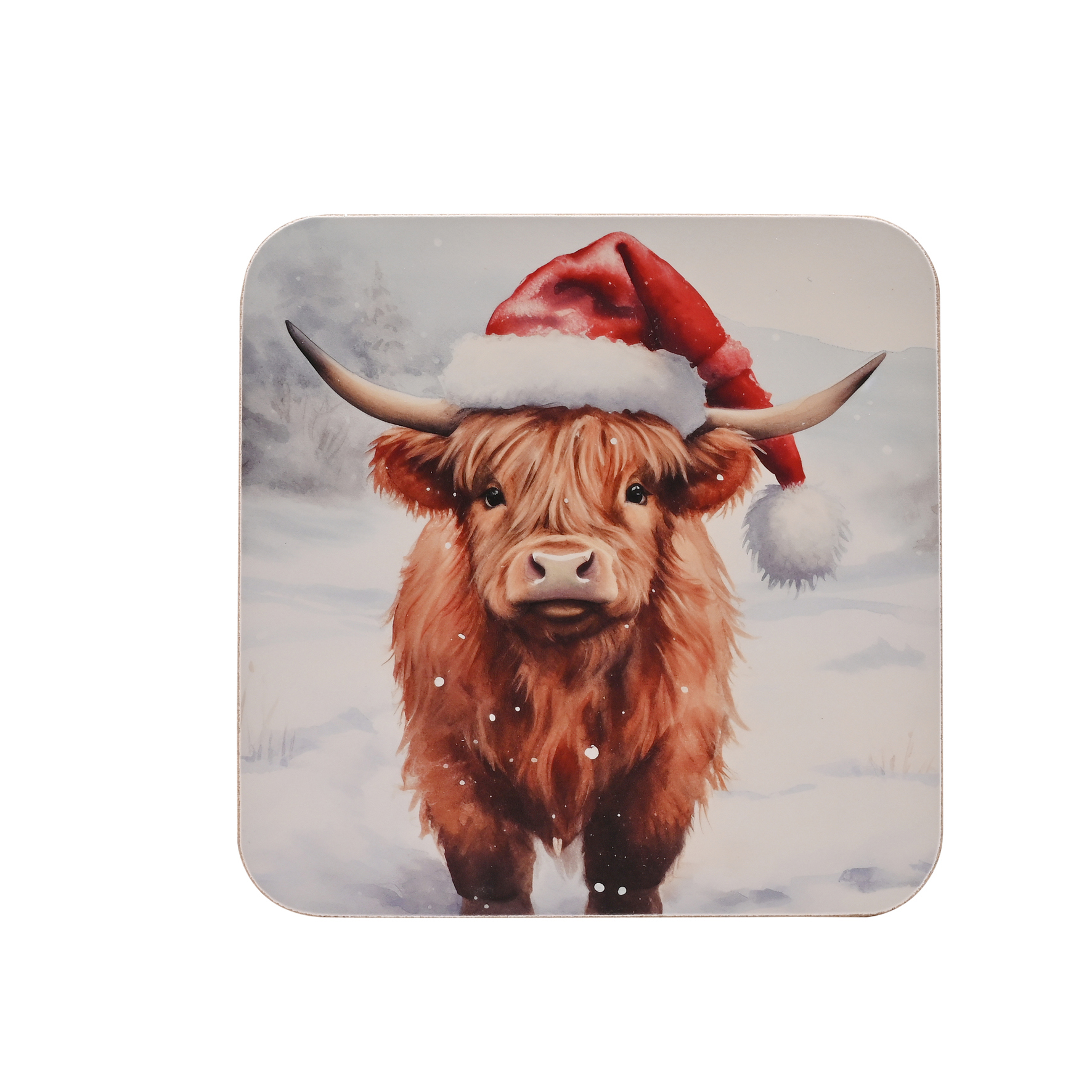 Add whimsy to your festive gatherings with our Set of 4 Christmas Highland Cow Coasters. These delightful coasters, featuring a Highland cow in a Santa hat, will surely bring smiles to guests' faces.