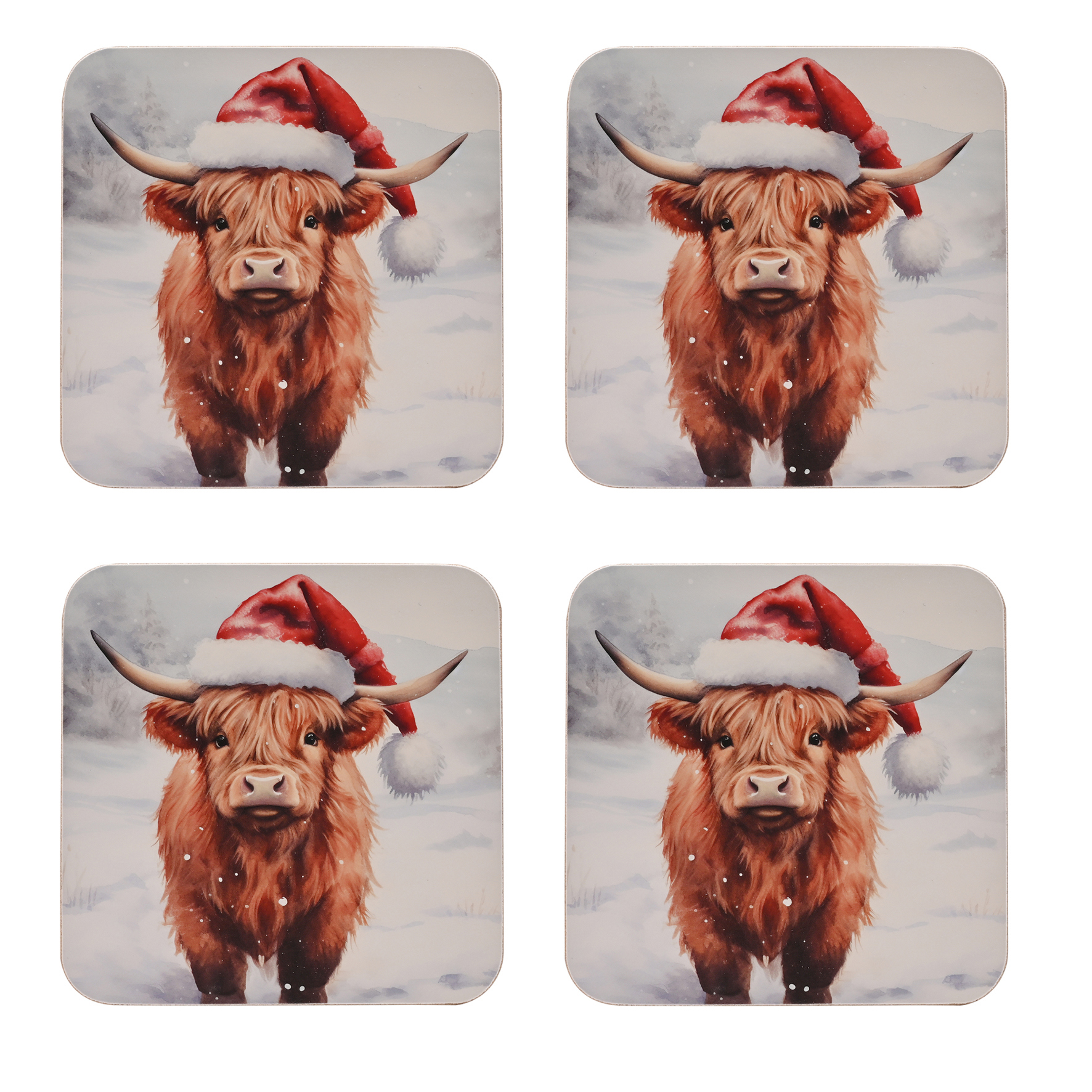 Festive Set of 4 Christmas Highland Cow Design Coasters