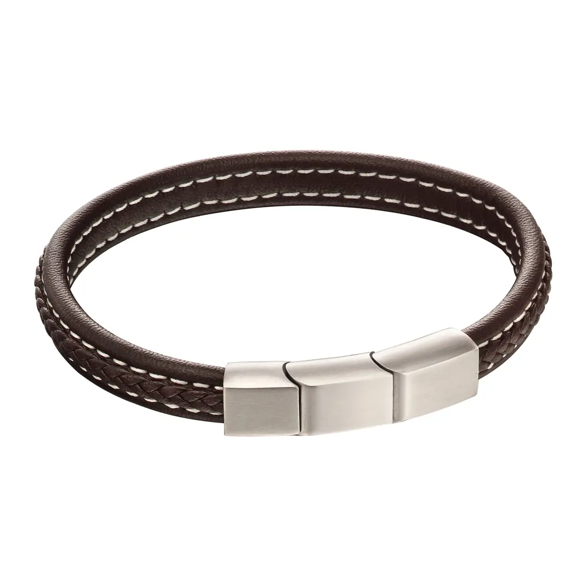 This bracelet has been crafted from brown leather with white stitch detailing. The bracelet features a stainless steel double slide in magnetic clasp. Perfect to stack with other bracelets from the Fred Bennett range. Comes gift boxed. Bracelet length 21cm