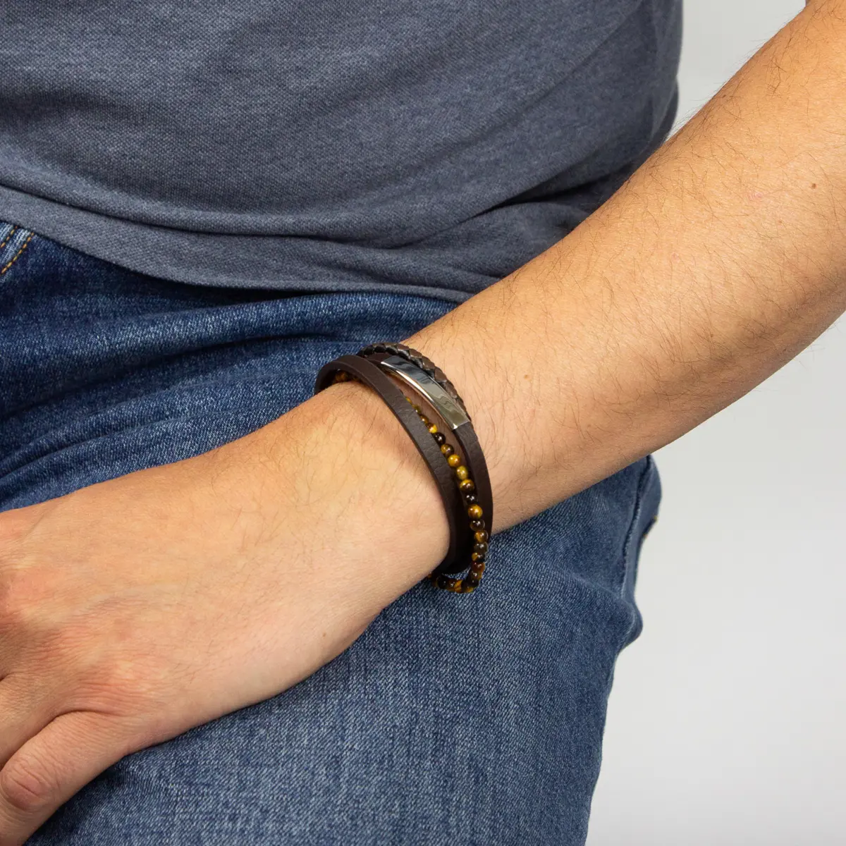 This leather and tiger bead bracelet makes the perfect gift for those who are concious about sustainability. Made using scraps of genuine recycled leather. Features brown recycled leather and a stainless steel clasp and ID Bar. Comes in a gift box. Bracelet length 21cm
