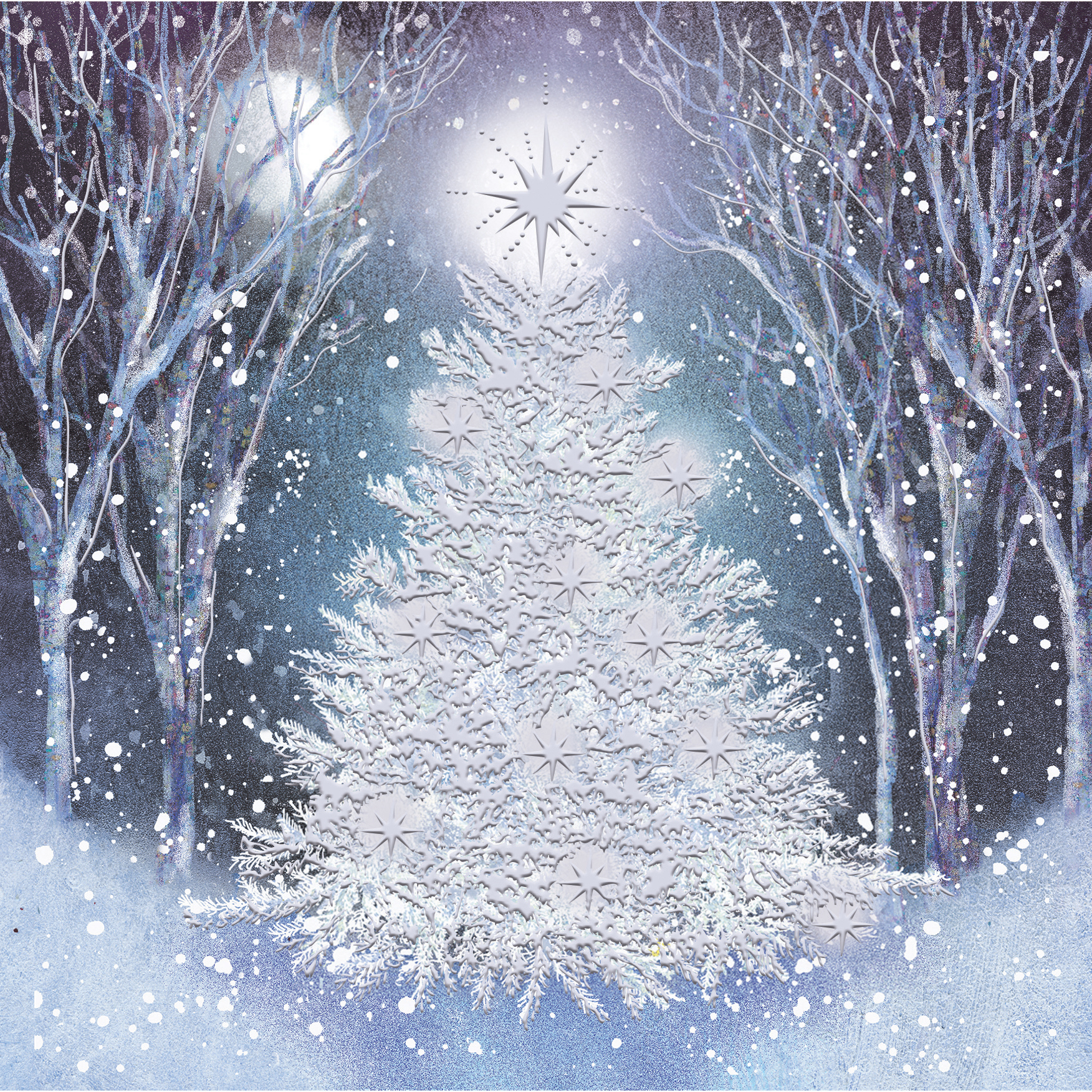 Capture the serene beauty of the season with our Snowy Christmas Tree Charity Christmas Cards. This stunning design features a majestic white tree illuminated by a radiant star, set against a moonlit winter forest. With softly falling snow and shimmering tones of silver and blue, it evokes the calm, peaceful magic of Christmas night.