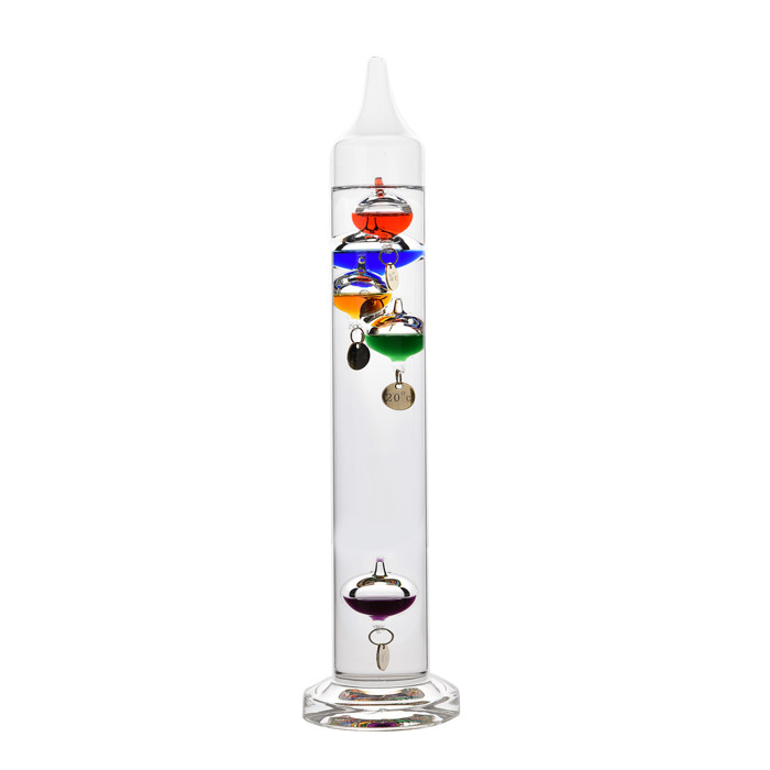 The Galileo Thermometer uses coloUrful floating bulbs that gently rise and fall throughout the day, reflecting shifts in temperature with precision and grace. Each bulb showcases a temperature reading, creating a mesmerizing display of form and function as they drift within the glass tube.