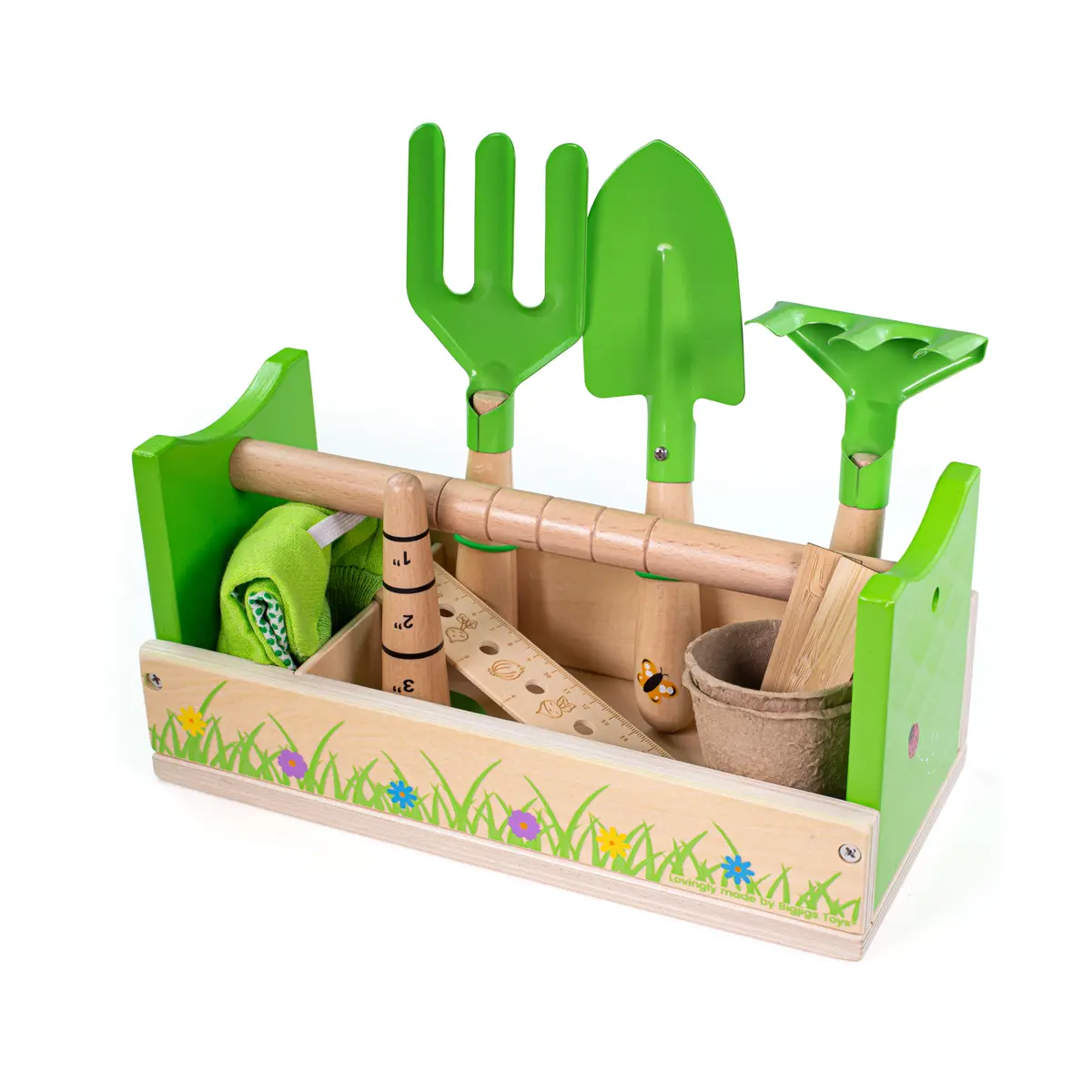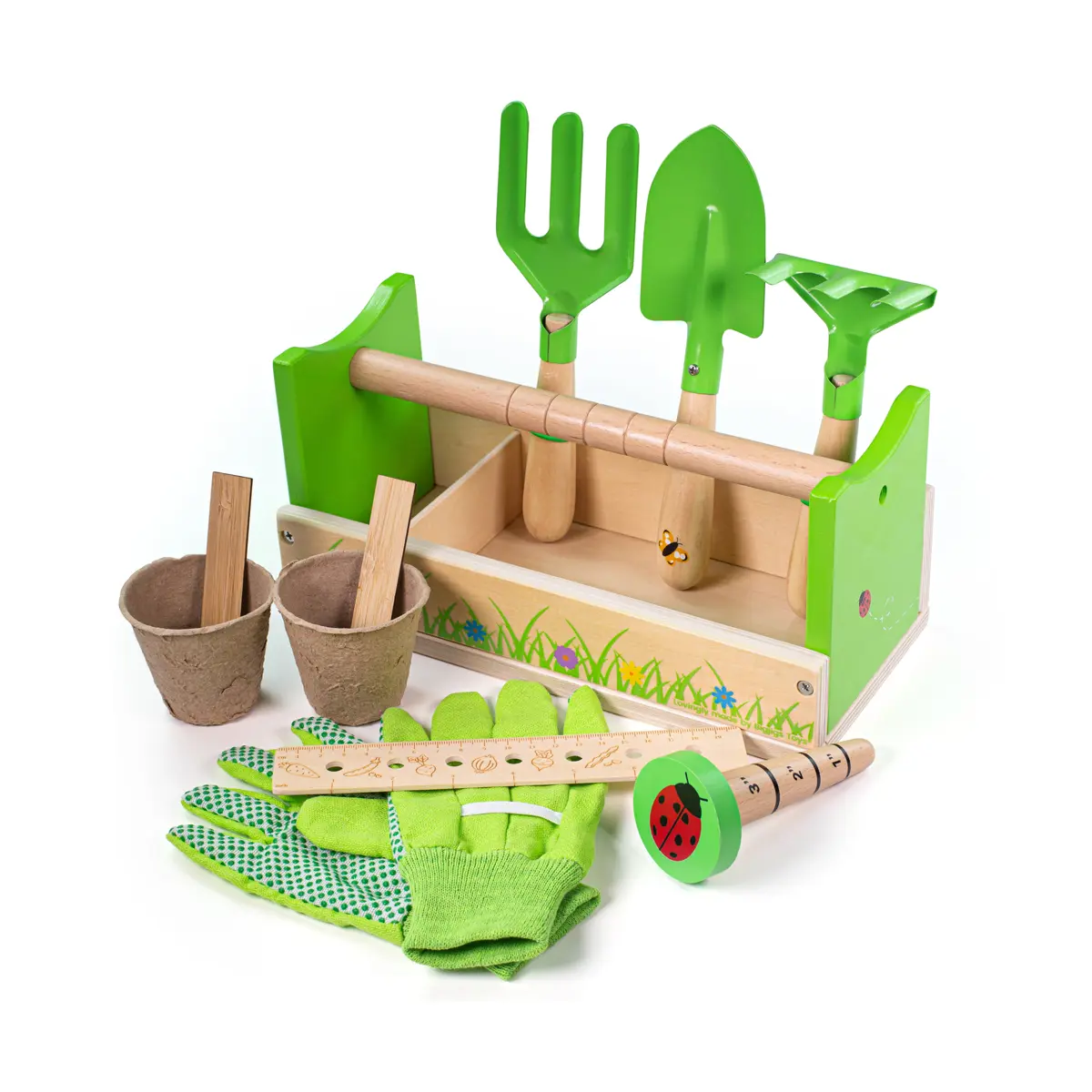 Ideal for gardens or window boxes, our Kids Garden Caddy is packed with childrens garden tools and everything young gardeners need to get started. Made from high-quality wood, the garden caddy is delicately decorated in a bright green shade with colourful flowers and ladybirds. Comes with 11 play pieces in total, including gardening gloves, a ruler, a trowel, a fork, a rake and much more. Each of the gardening tools are specially designed for little hands in mind. The handles are crafted from smooth wood and are easy to grip. Our kids gardening tools are made from high quality, responsibly sourced materials. Conforms to current European safety standards. Suitable for 3 years + Gardening Caddy product features: Garden caddy with 11 play pieces, including gardening gloves, a ruler, a trowel, a fork, a rake and much more High-quality kids gardening tools Ideal for use in the garden or with window boxes 23cm H x 28.2cm W x 13cm D 3 years +