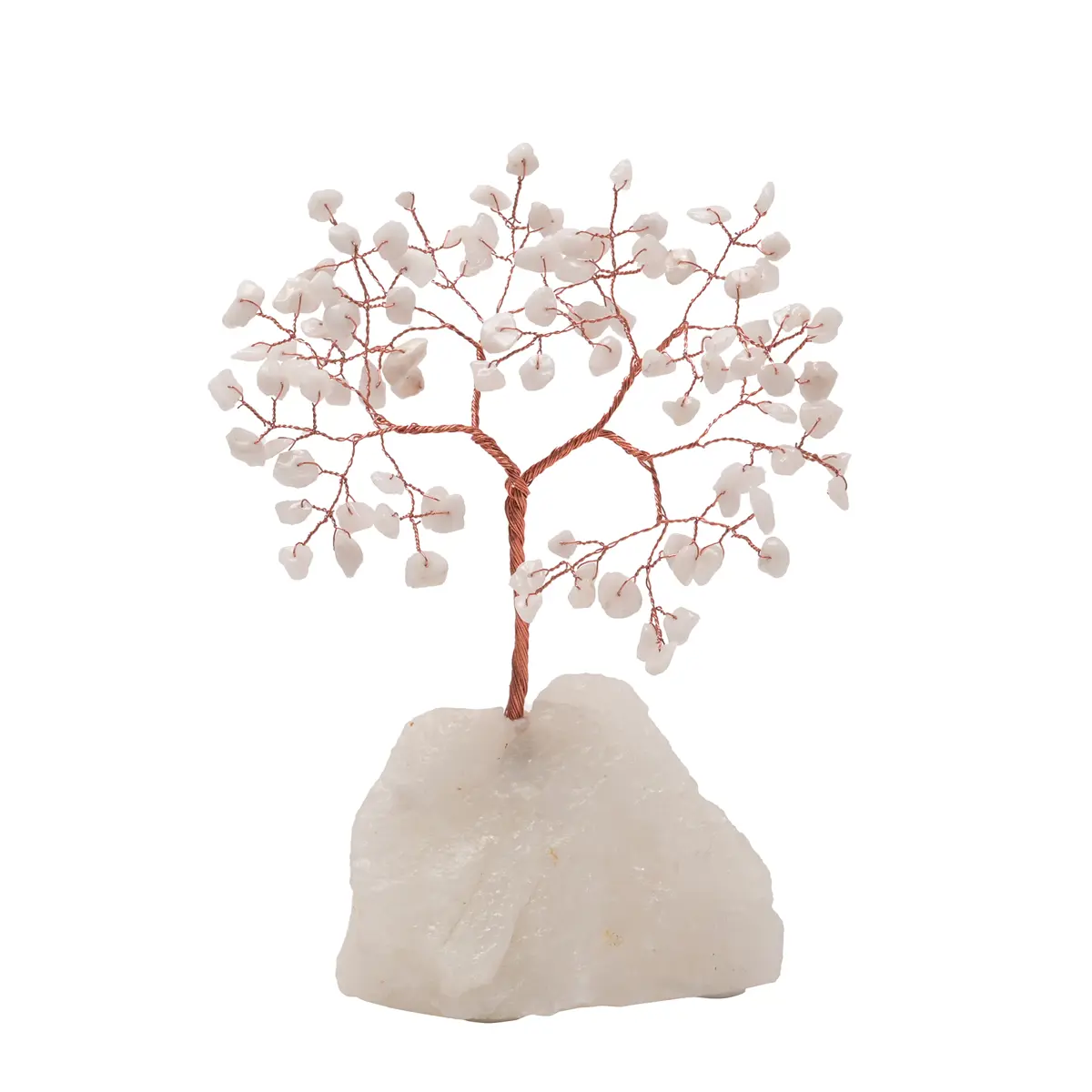 The small, white jade gemstone tree showcases a twined copper pink metal trunk and branches, upon which hang 100 genuine matching white jade crystals on a white quartz base.