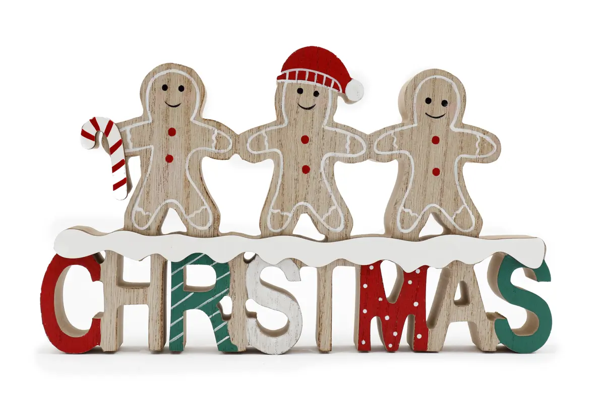 The base spells out Christmas, with the gingerbread men cheerfully perched on top. Each figure is crafted from high-quality wood and adorned with festive accessories that are sure to bring a smile to your face.