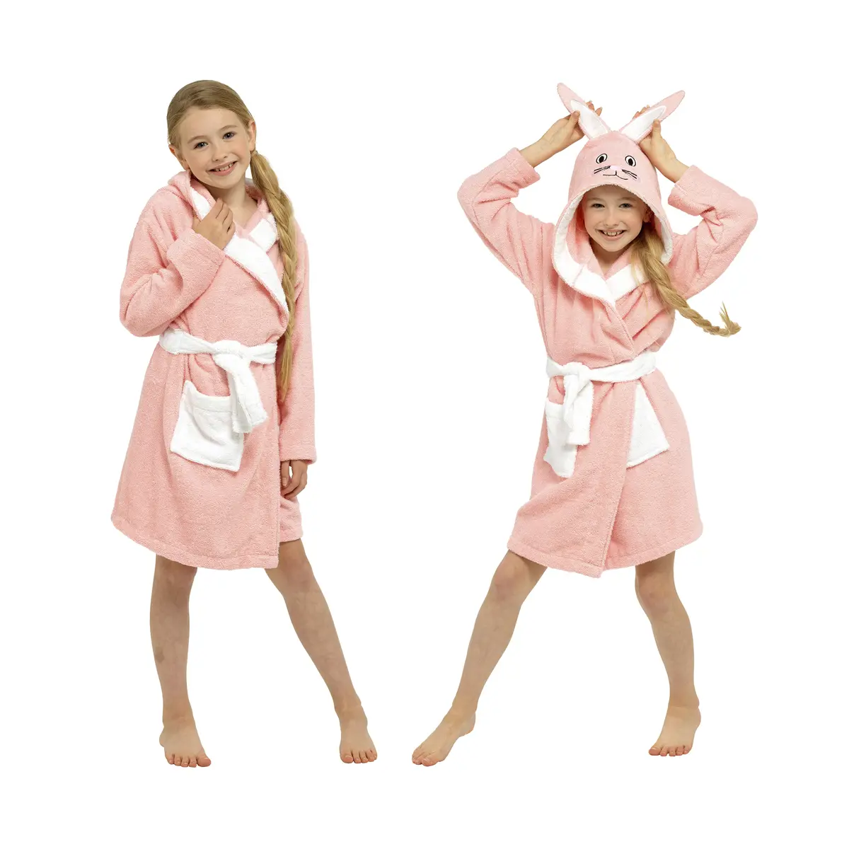 Girls Pure Cotton Pink Bunny Hooded Towelling Robe