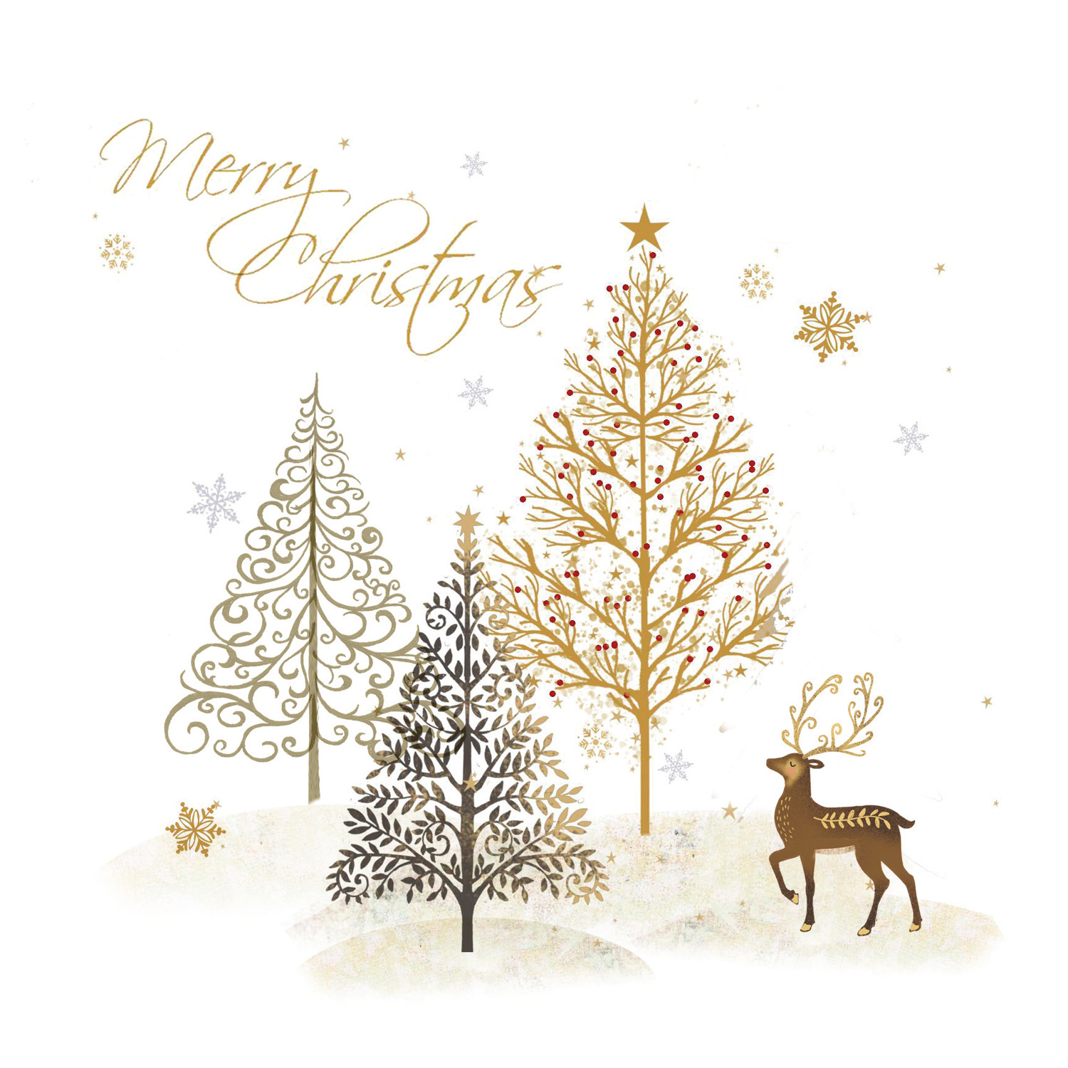 Send timeless festive elegance with our Merry Christmas Charity Christmas Cards. This sophisticated design features beautifully detailed gold and silver Christmas trees surrounded by delicate snowflakes, with a graceful reindeer standing proudly beneath a shimmering star. The subtle metallic tones and refined artistry make this the perfect card for those who appreciate classic seasonal beauty.