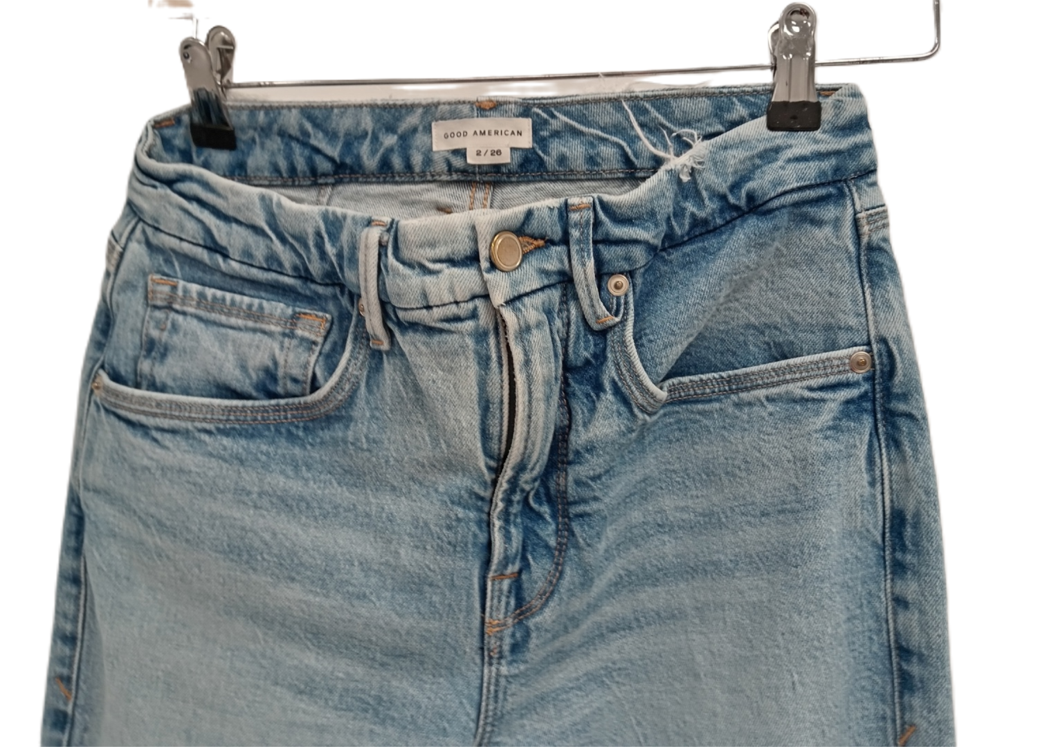These skinny-fit jeans feature a classic blue wash with a distressed finish for a trendy, laid-back vibe. Designed with a mid-rise waist and figure-hugging silhouette, they provide a flattering fit that complements a variety of outfits. Finished with signature GOOD AMERICAN details, including reinforced stitching and subtle branding, these jeans bring effortless edge to your look.