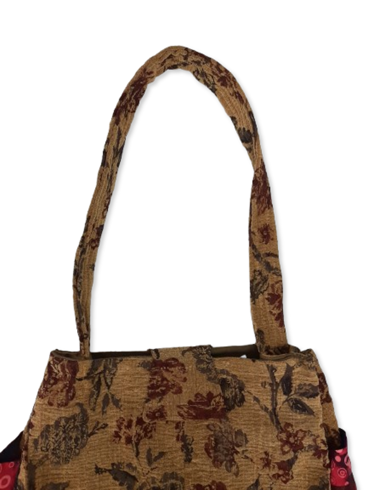 Material: Mixed materials – repurposed tapestry-style fabric with lined interior.