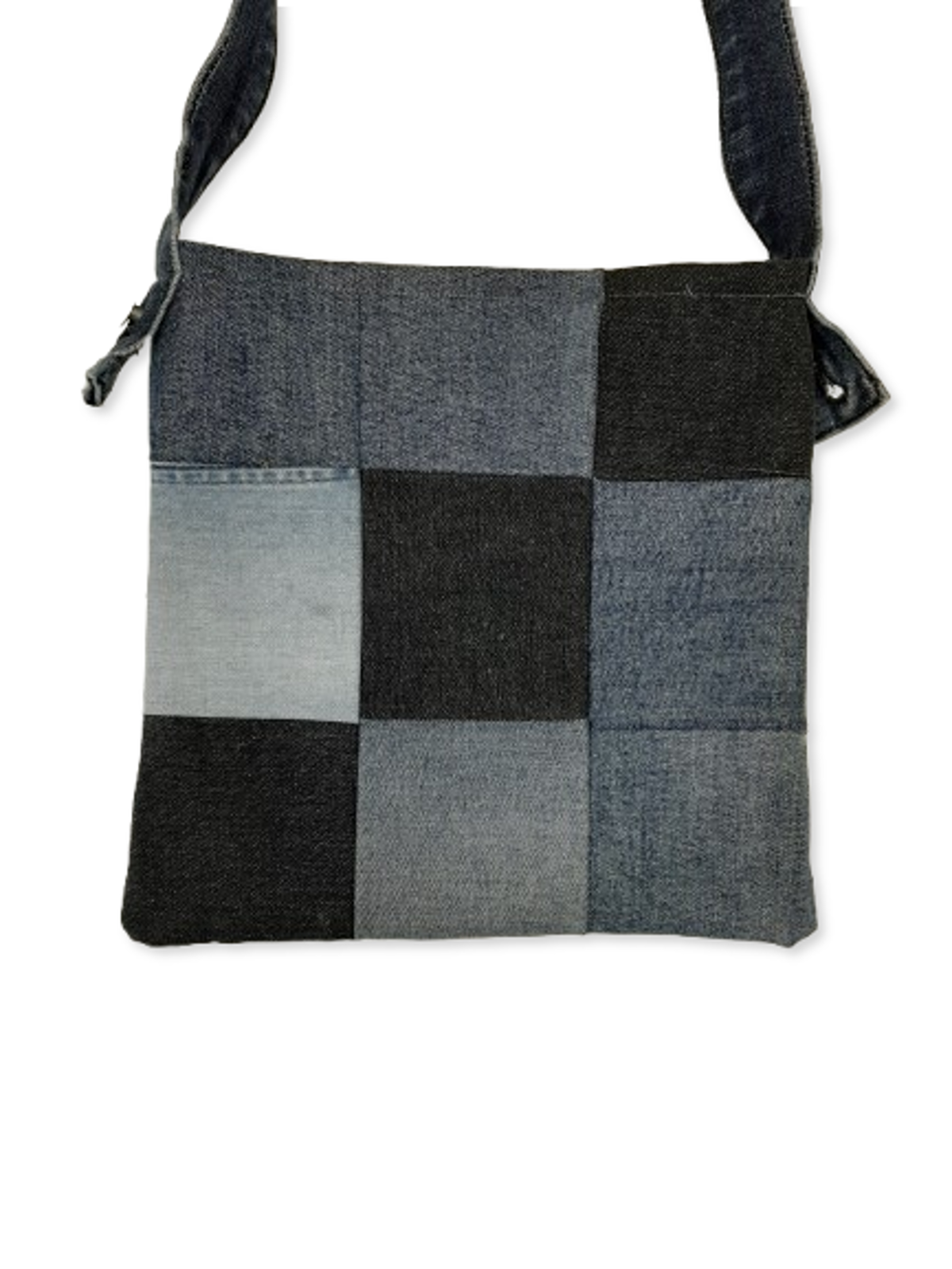 Colour: Blue denim patchwork.