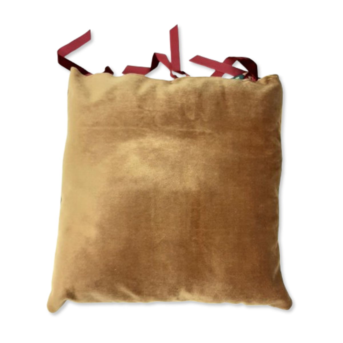 Add a bold statement to your home décor with this Handmade Upcycled Gold Cushion, featuring a striking large red heart design on a soft velvet-style fabric. Finished with a red velvet ribbon tie toggle closure and a plush, padded feel, it’s a charming and sustainable accent piece perfect for sofas, beds, or cosy reading corners.