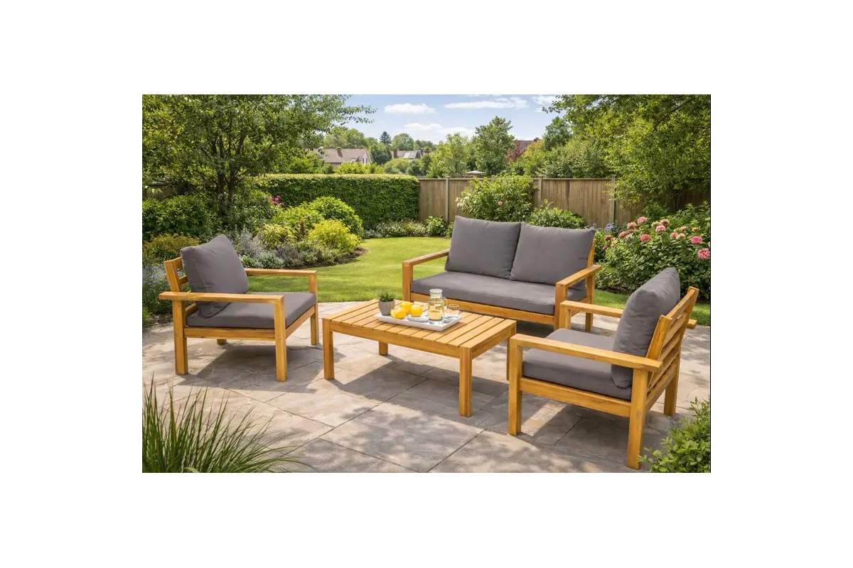 Crafted from acacia wood with a teak-effect oil finish, the set combines sturdy construction with soft grey cushions for added comfort. With generous seating, a practical coffee table, and easy-assembly design, it’s a stylish and inviting choice for enjoying the outdoors season after season.