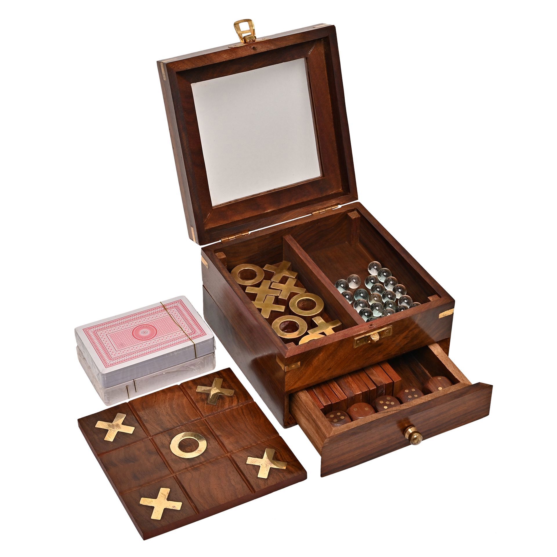 Looking for the perfect games set? The Harvey Makin 5 in 1 Game Set has it all – whether you’re feeling like a game of cards or tic tac toe, you’ll find enough excitement in this set to keep you occupied for hours on end. Encased in an acacia wood box with brass detailing, its content includes a tic tac toe board and pieces, marbles, playing cards, dominoes and five die.