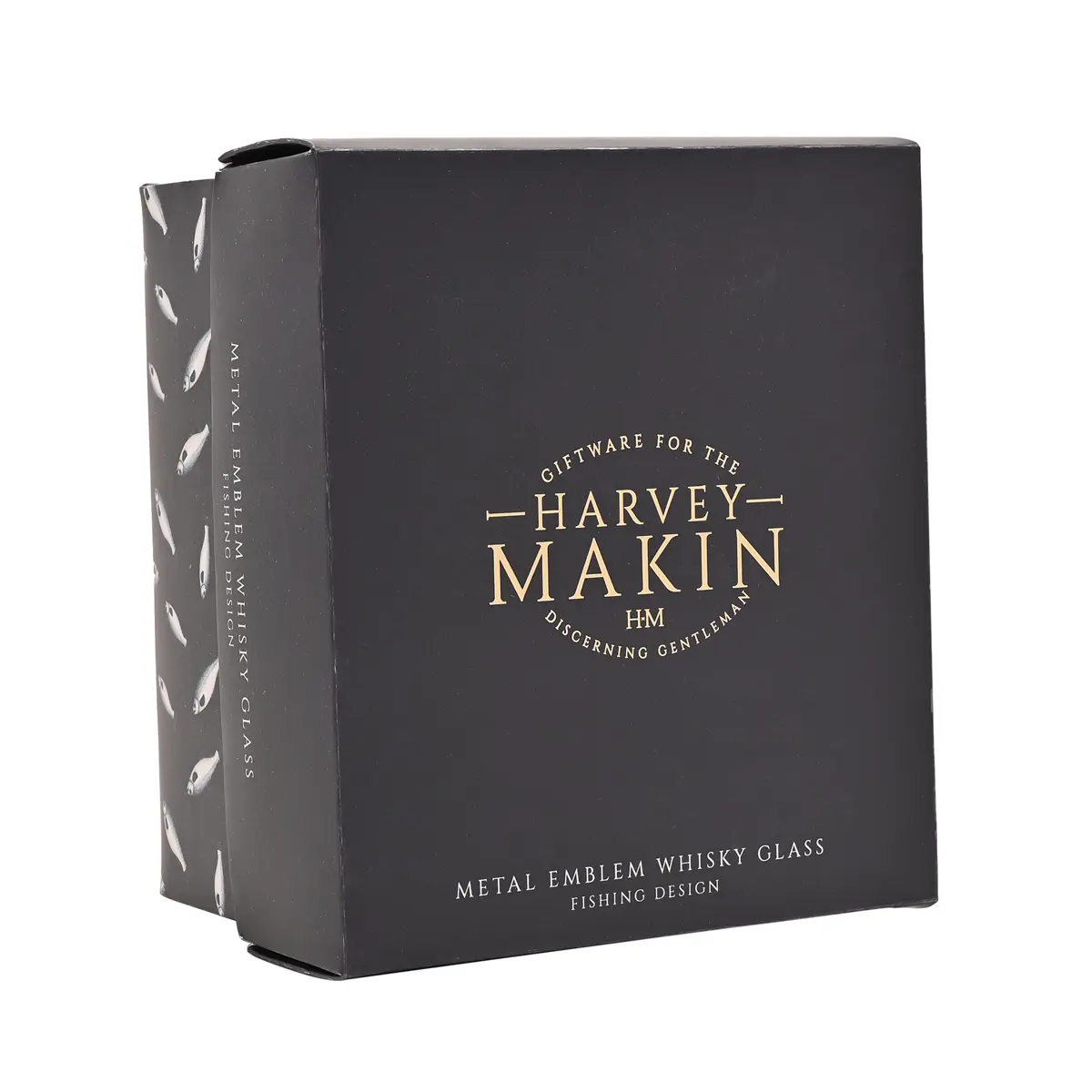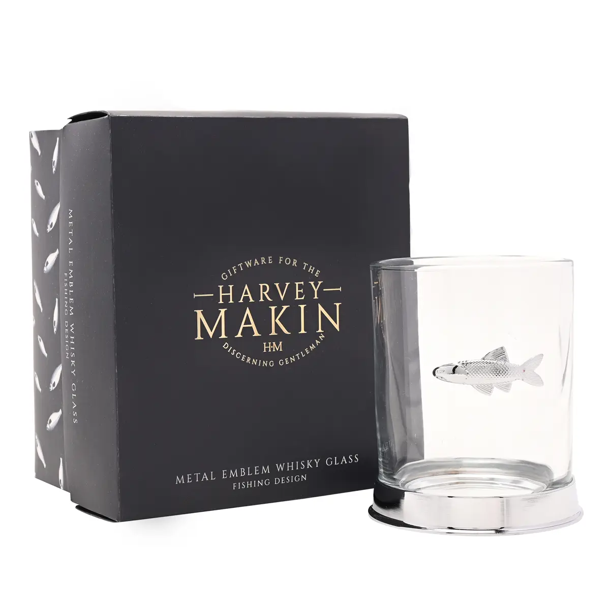 This clear glass tumbler features a distinctive metal fish detail, making it a standout piece for whisky lovers and fishing enthusiasts alike. Presented in a branded box, it is ready to give as a gift or enjoy as part of your own glassware collection.