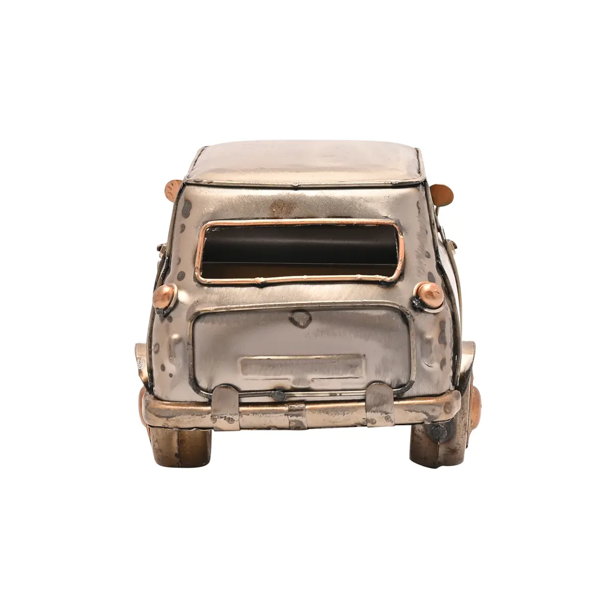 Crafted from metal, the ornament captures a timeless vintage aesthetic, with its boxy car shape and weathered look making it a perfect conversation piece. Whether as a gift for car enthusiasts or a charming keepsake, this piece brings a retro vibe to any room.
