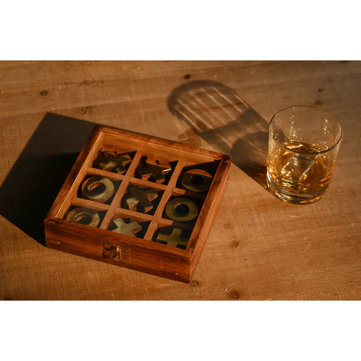 Take some time out to reconnect with your playful side with the Harvey Makin Tic Tac Toe set. The beautiful brown wooden case is decorated with brass inlay and is timeless enough to match any home decor – perfect for propping up on your coffee table. The set includes a case and brass game pieces.