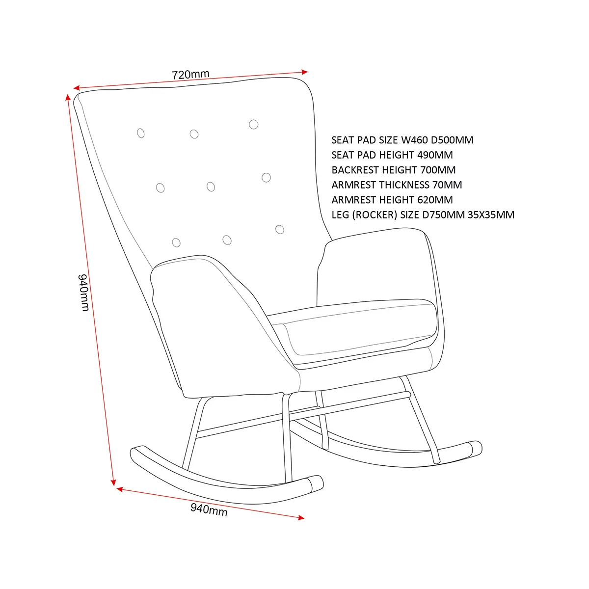 The Hayden Rocking Chair brings timeless elegance and modern comfort into your home. Designed with a sleek silhouette and upholstered in high-quality fabric, this chair combines sophistication with practicality. Its contemporary take on the classic rocking chair features wooden feet for a fresh, stylish look that complements modern interiors. With a high backrest, button-tufted detailing, and plush cushioning, the Hayden Rocking Chair offers exceptional support and comfort—perfect for reading, relaxing, or unwinding in style. Whether placed in a cosy corner, living room, or lounge area, this chair enhances any space with its refined design and inviting feel.