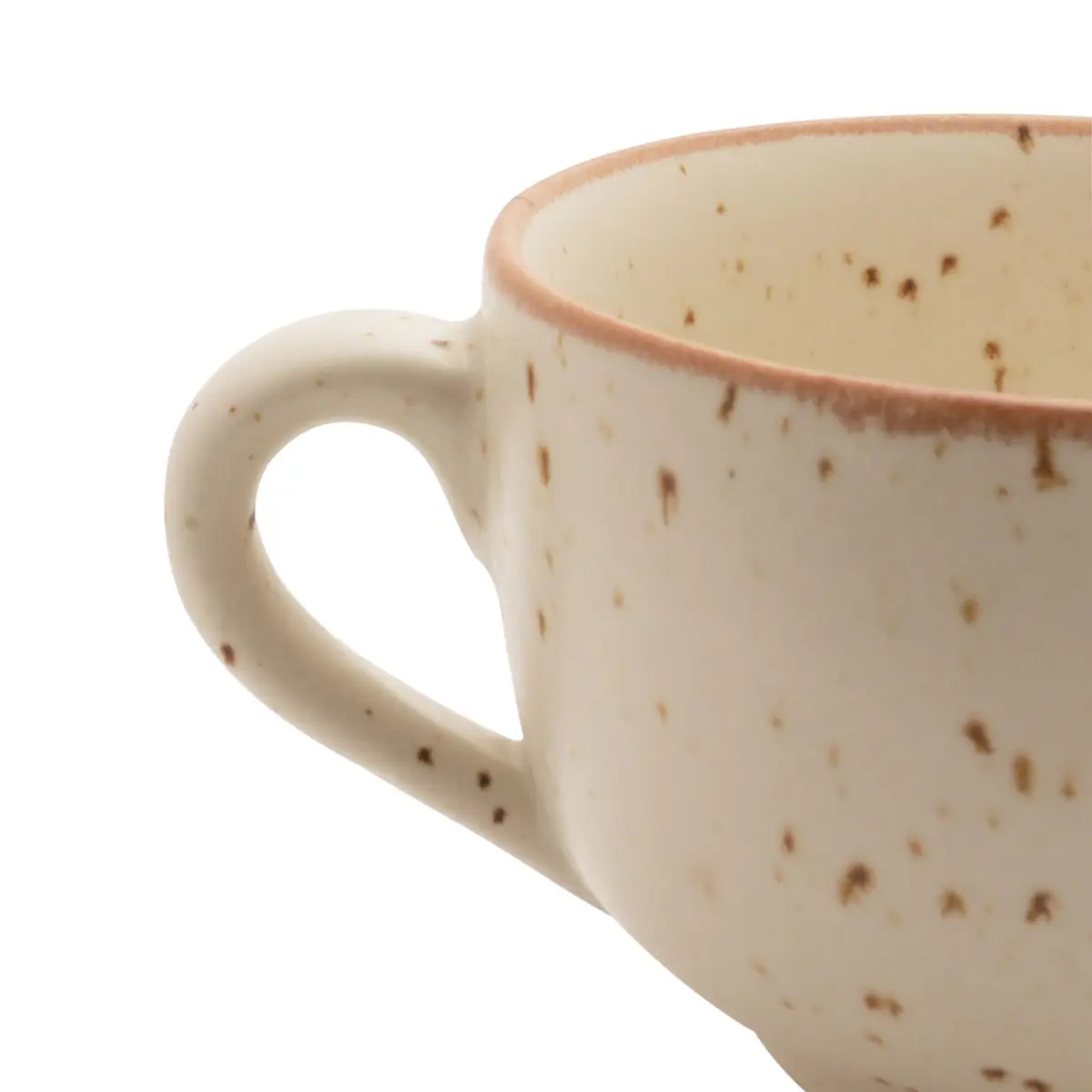 • Predominantly white with a brown rim and speckled design
