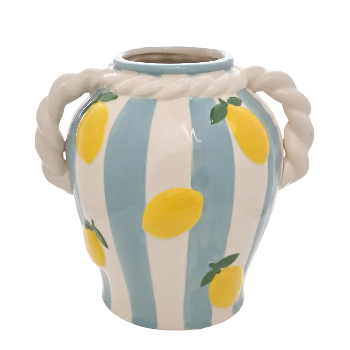 Add a splash of Mediterranean charm to your space with this vibrant ceramic vase from Hestia. Featuring a lively pattern of bright yellow lemons and bold blue stripes against a fresh, light background, this piece is bursting with character. The textured surface and quirky rope-effect handle lend a nautical twist, making it a delightful addition to any shelf, table, or windowsill. Whether filled with flowers or styled as a standalone statement, it brings sunshine and personality into your home.