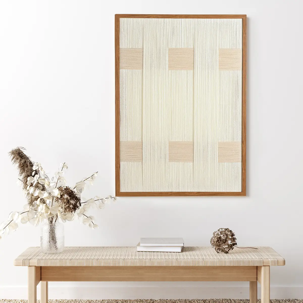 Bring subtle sophistication to your home with the HESTIA® Thread Wall Art Picture. Featuring a geometric arrangement of interlinked threads in soft beige and off-white tones, this contemporary piece blends clean lines with delicate texture to create a balanced and eye-catching design. Set in a wooden frame, it’s the perfect accent for modern minimal or relaxed neutral interiors.