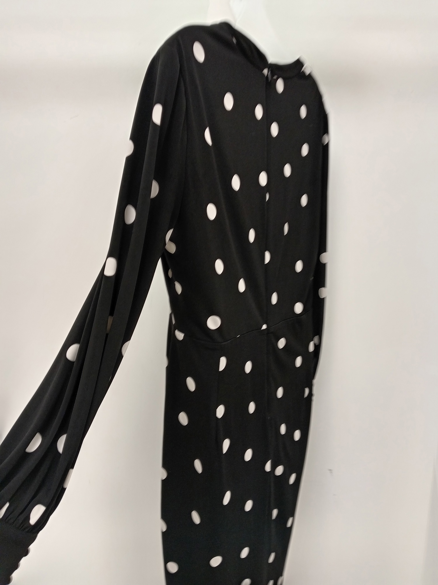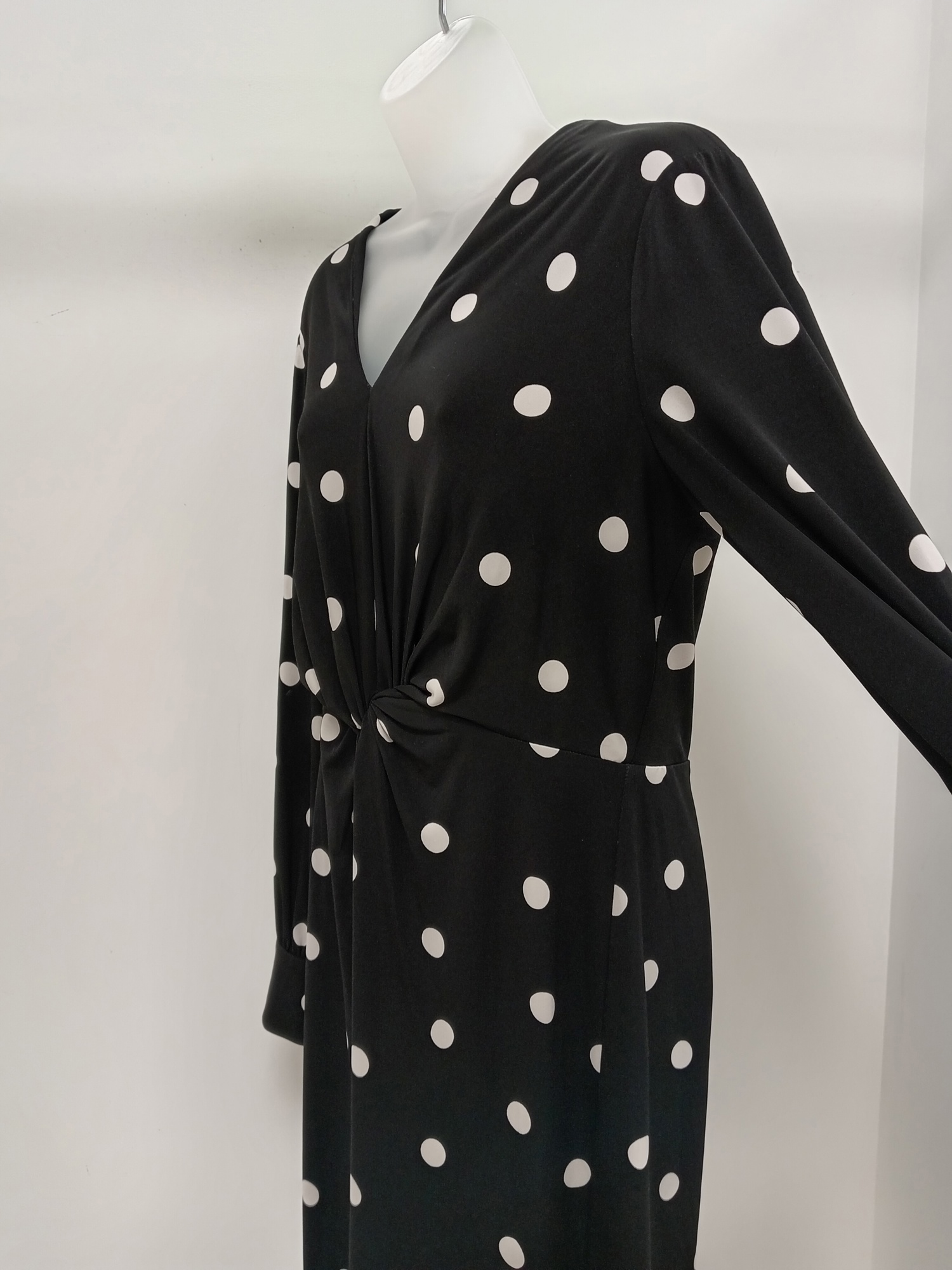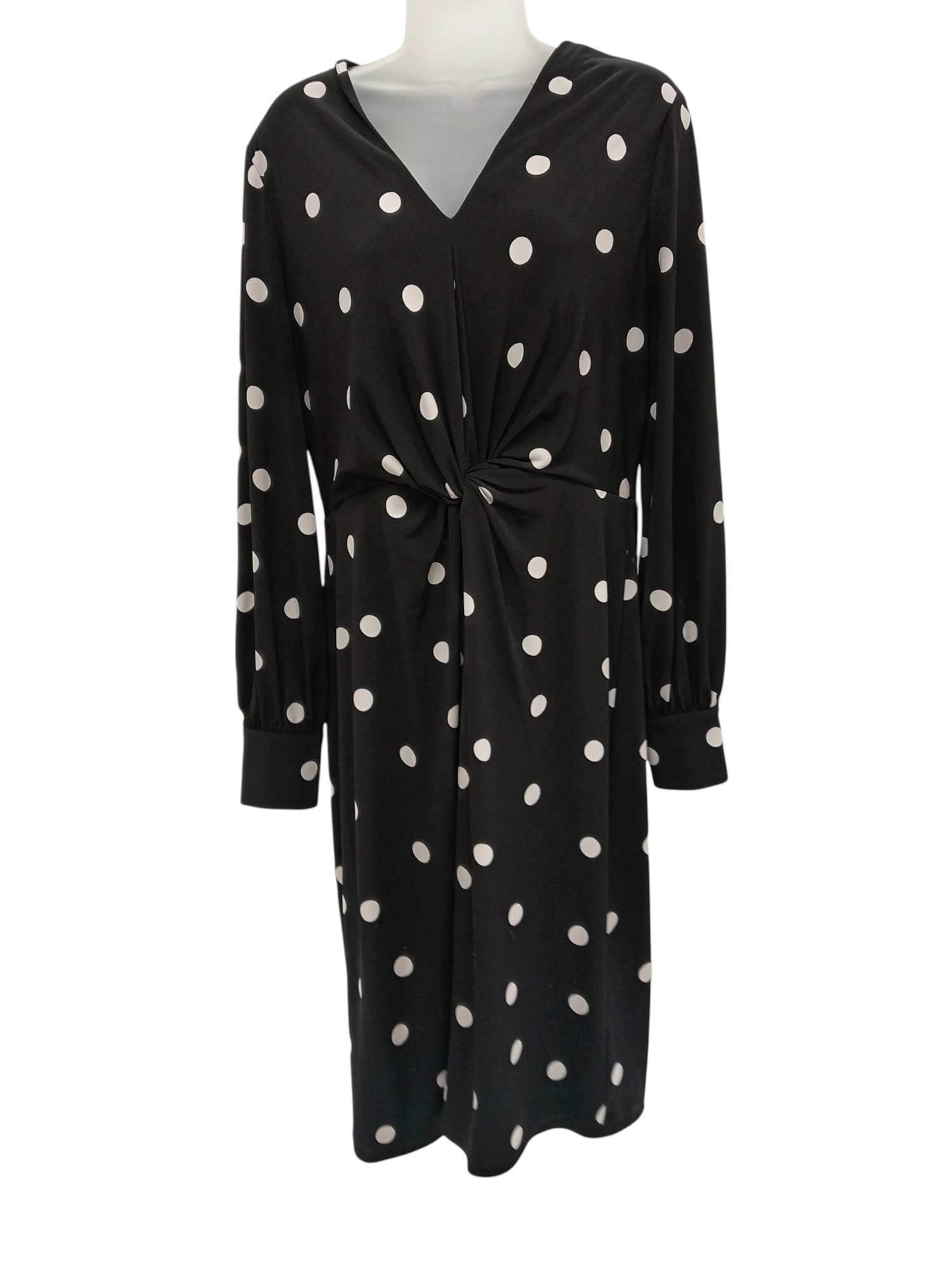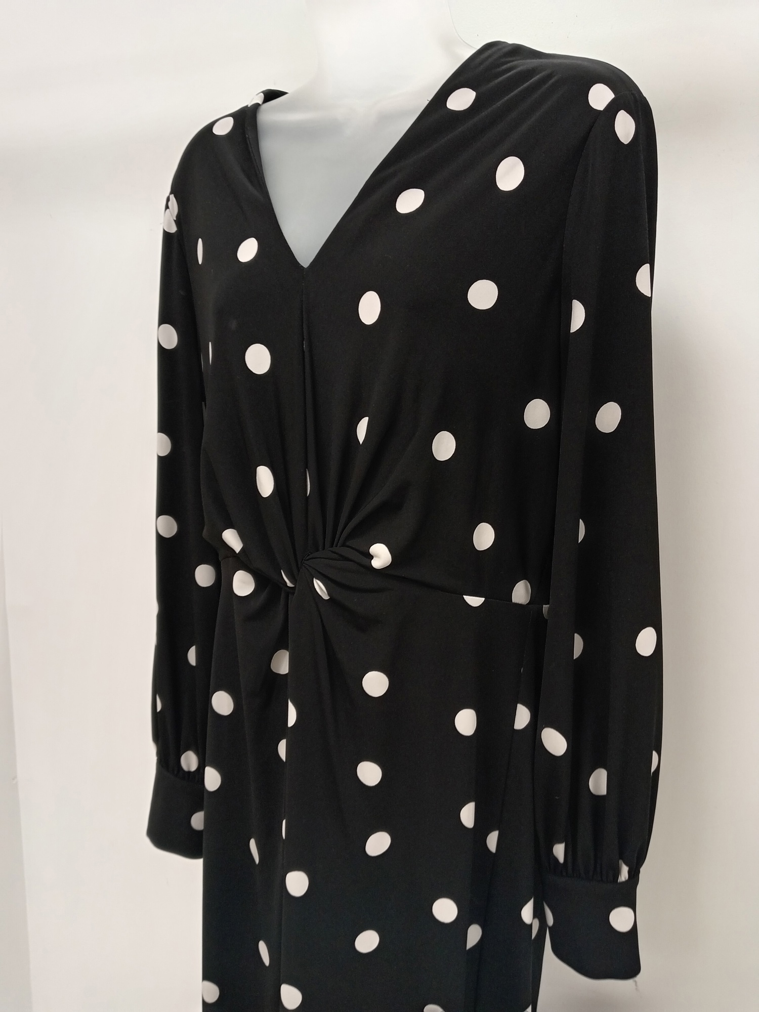 HOBBS Ladies UK Size 16 Monochrome Polka Dot V-Neck Ruched Black Dress – Pre-Loved (Used Condition)