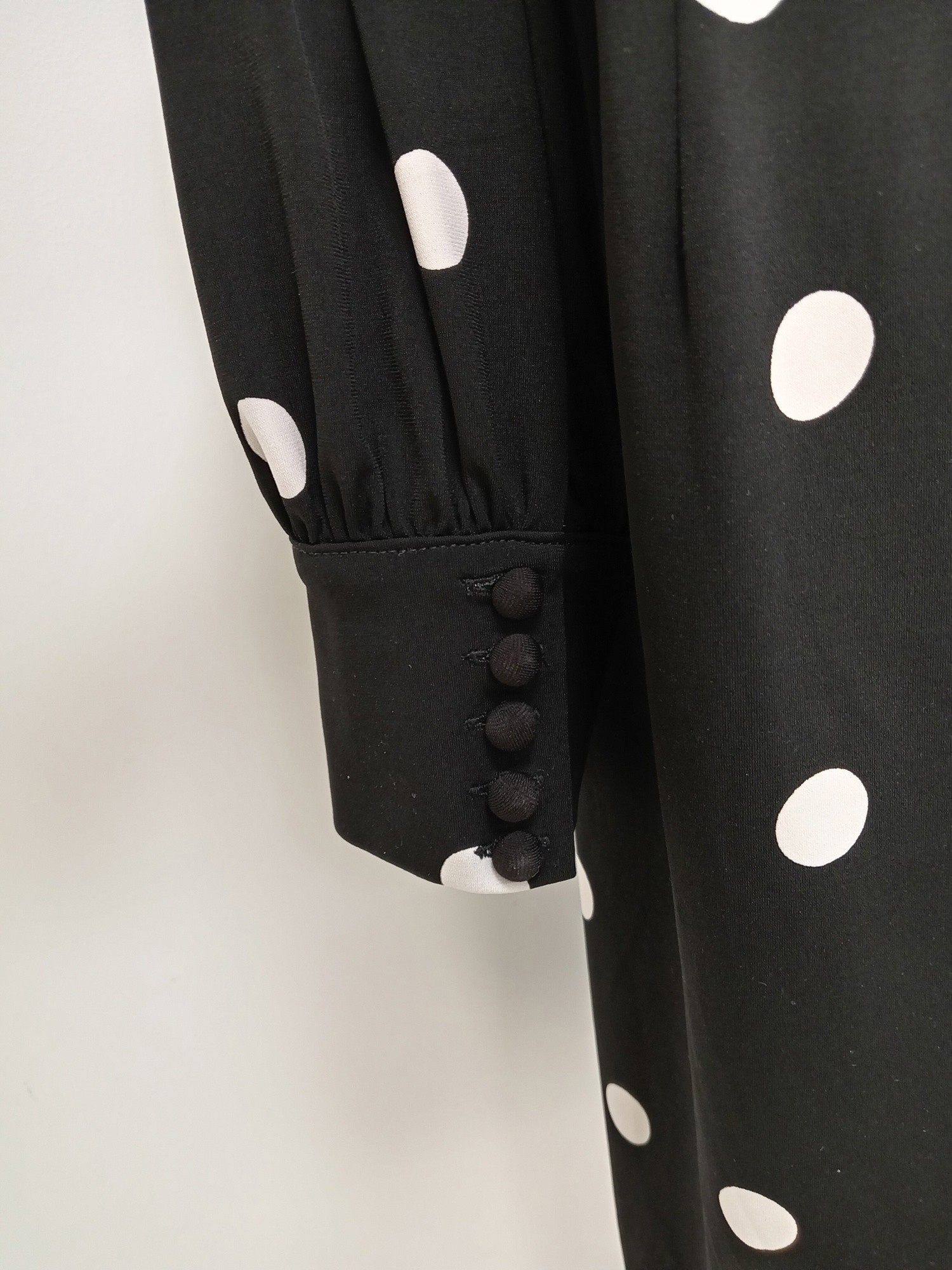 Crafted in a soft, draping fabric, the dress falls gracefully to just below the knee and showcases an all-over white polka dot print on a classic black base — a true wardrobe staple with a refined, vintage-inspired touch.