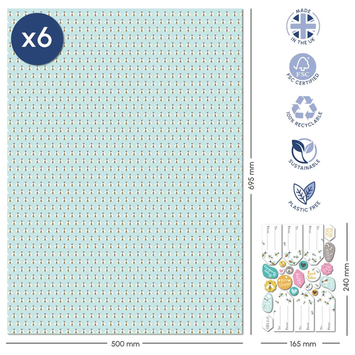 This beautiful bee themed wrapping paper is perfect for birthdays, anniversarys, thank you gifts and more! Made in the UK using paper from responsibly sourced forests. Printed using 100% vegan, vegetable based inks and 100% plastic free. Contains 6 sheets of wrap and matching sticker tags. Each sheet measures 50 x 69.5cm approx