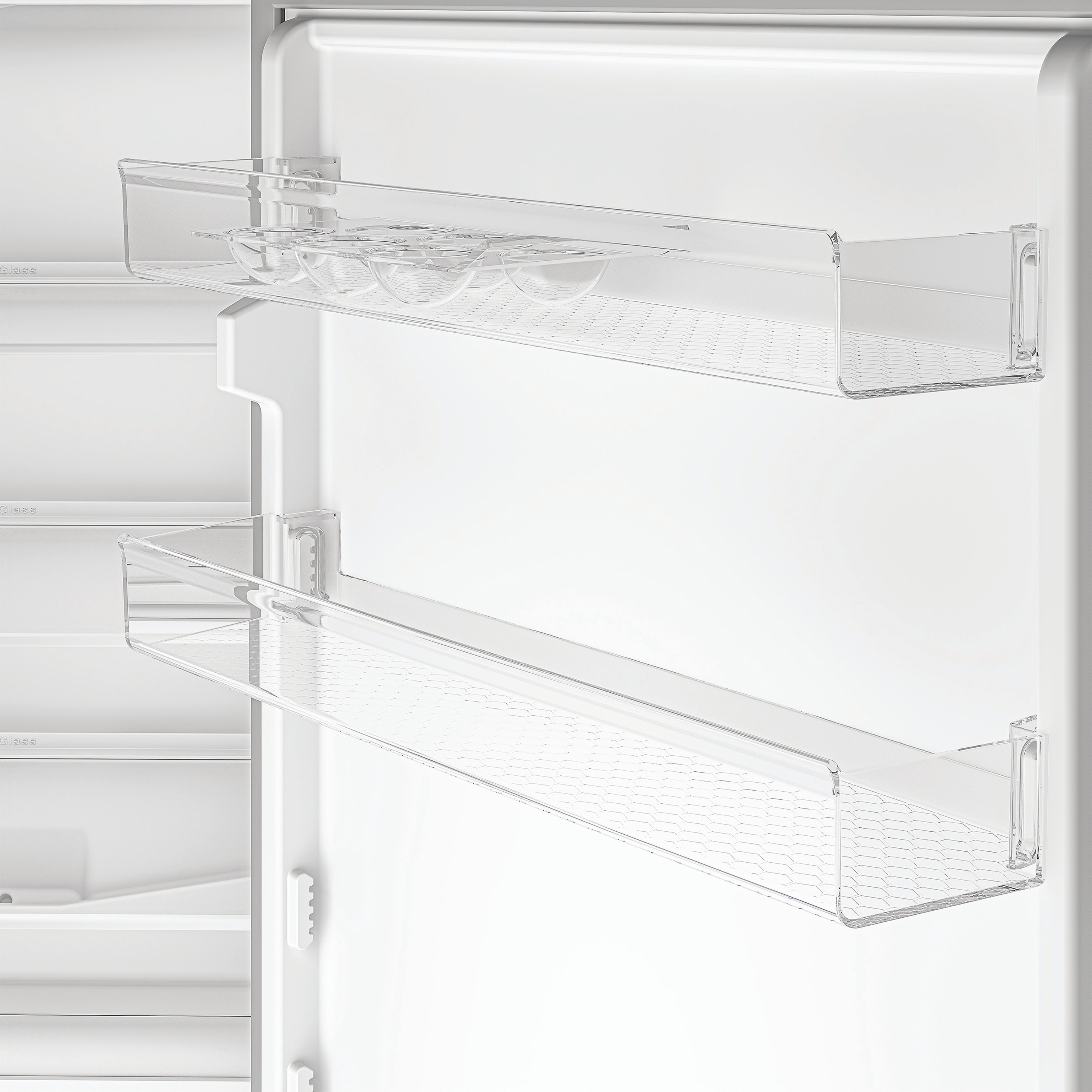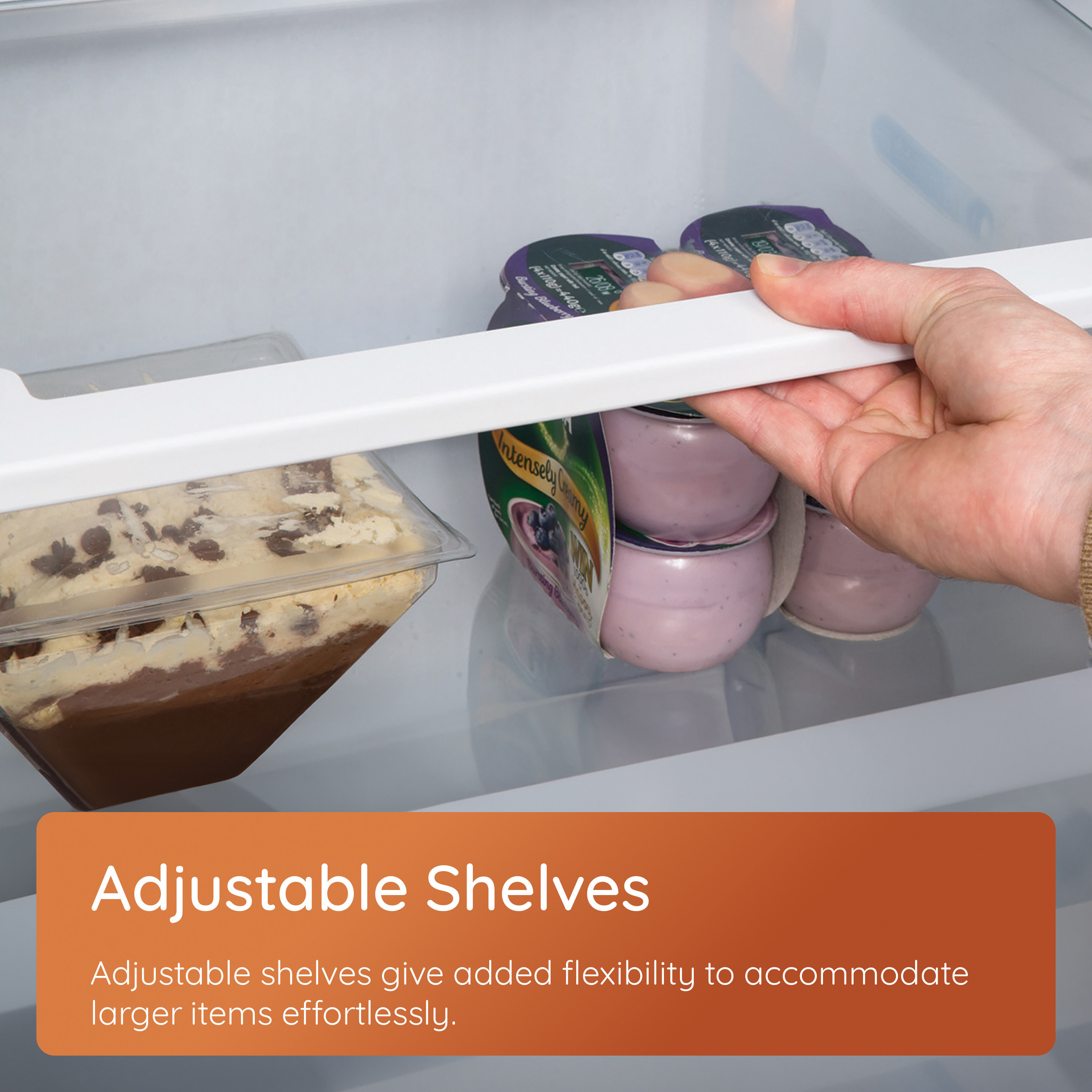 • Adjustable shelves allow flexible storage for larger bottles and bulkier items