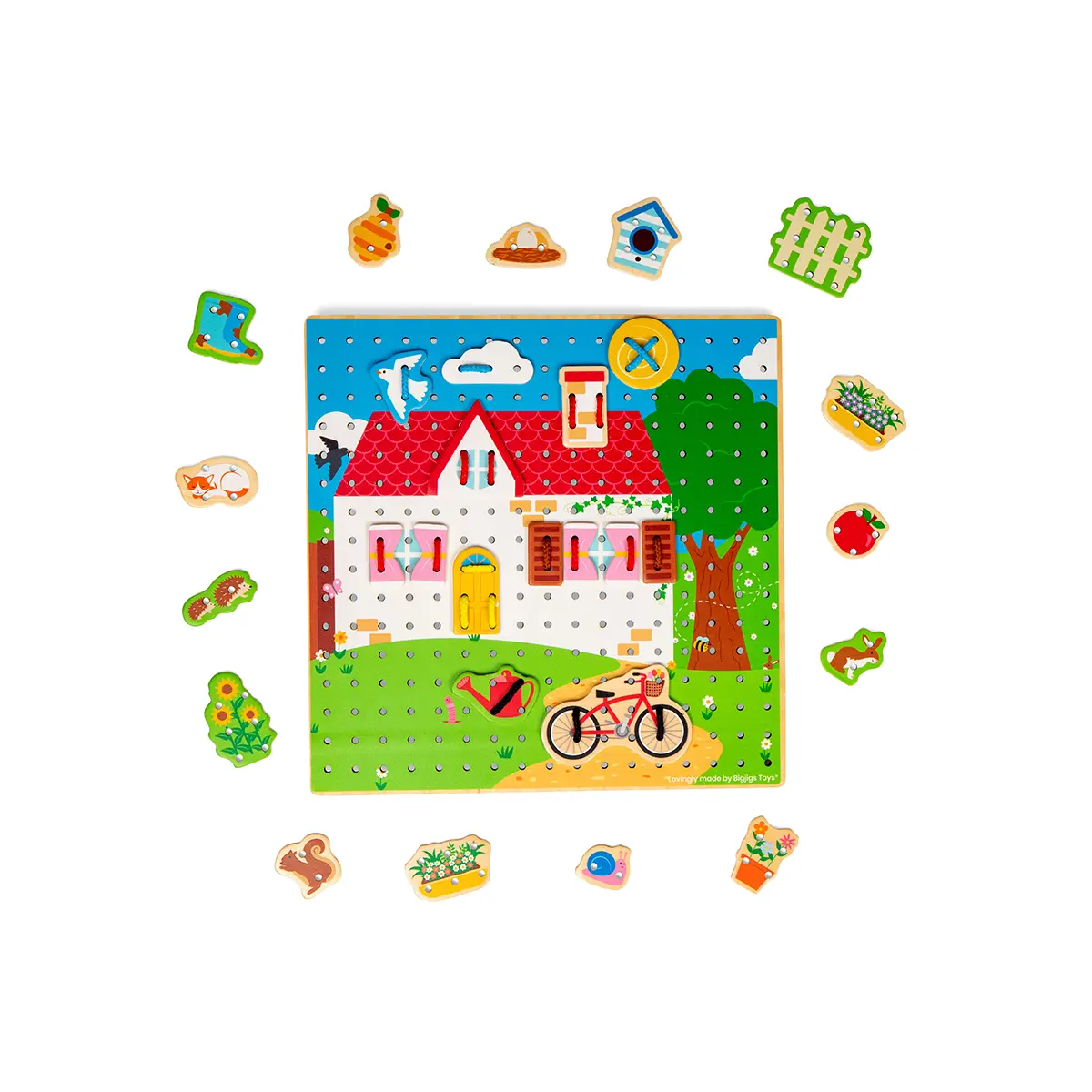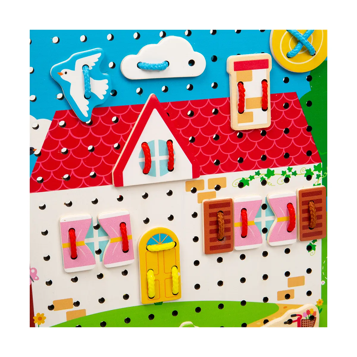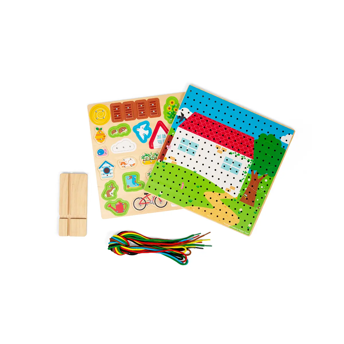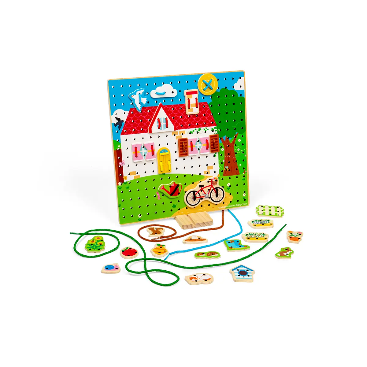 Design your dream house! Thread the laces through the house shapes and onto the baseboard to create a picture-perfect scene. Wooden threading toys are a fun way to develop kids’ hand-eye coordination, fine motor and sequencing skills. Our House Lacing Game For Toddlers features 30 different shapes and six different coloured laces to create a house. Youngsters need to simply thread the laces through the shapes and onto the baseboard to create a picture. Made from high quality, responsibly sourced materials. The laces are also high quality and safe for tots to use. Conforms to current European safety standards. Suitable for 3 years +. House Lace-a-Shape - product features: 30x house shapes 6x laces Develops fine motor skills Made from high quality, responsibly sourced materials 3 years +