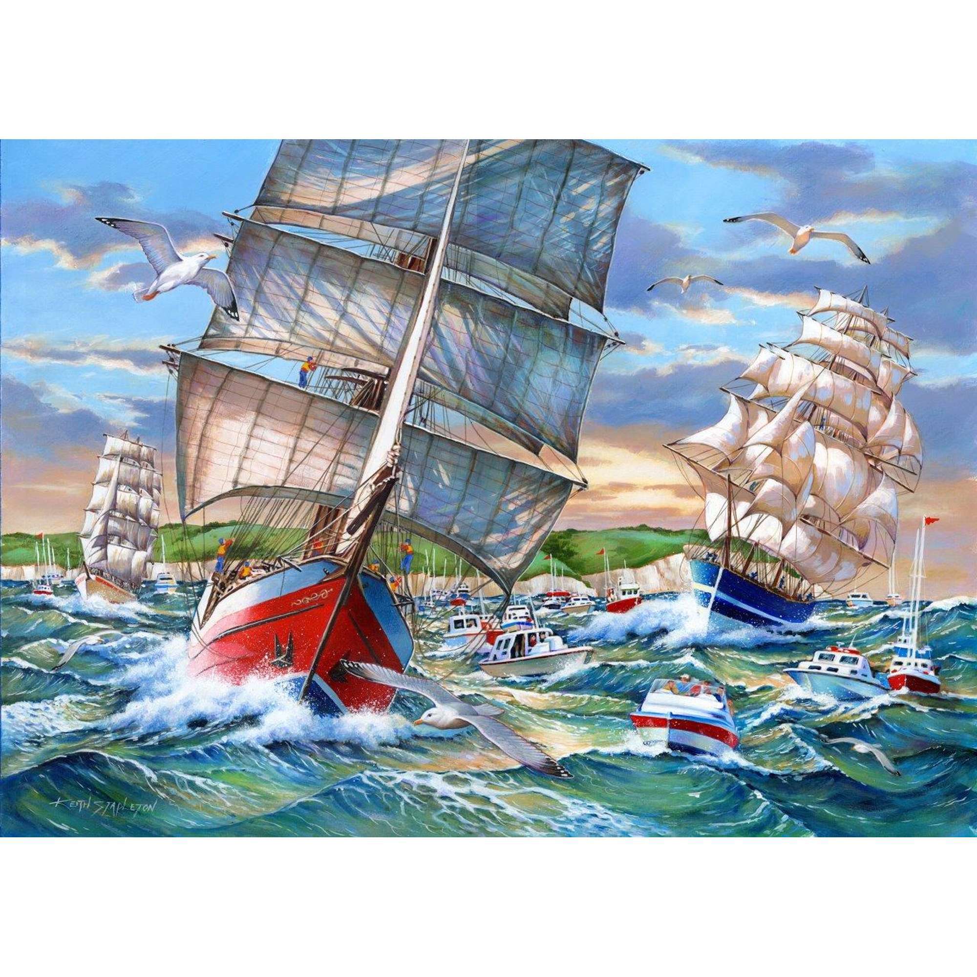 Set sail on a puzzling adventure with the House of Puzzles Tall Ships Jigsaw, a 1000-piece puzzle beautifully illustrated by Keith Stapleton. With its intricately detailed maritime scene featuring tall ships and small boats crashing through the waves. This design offers hours of enjoyment for both beginners and experienced puzzle enthusiasts.