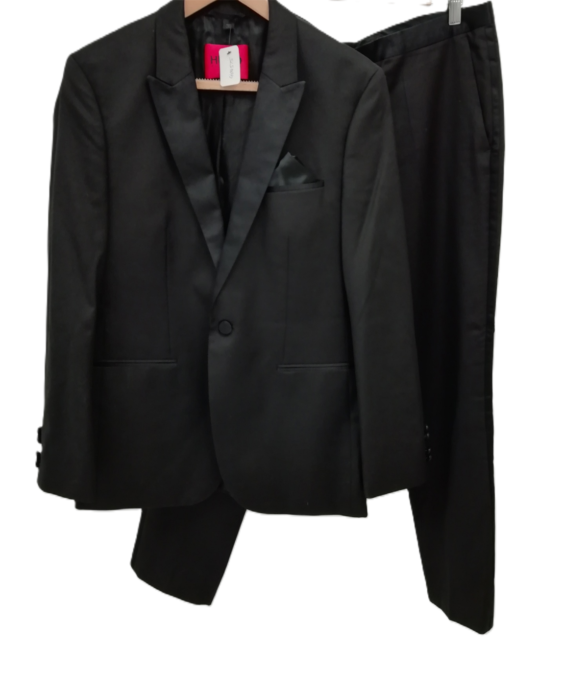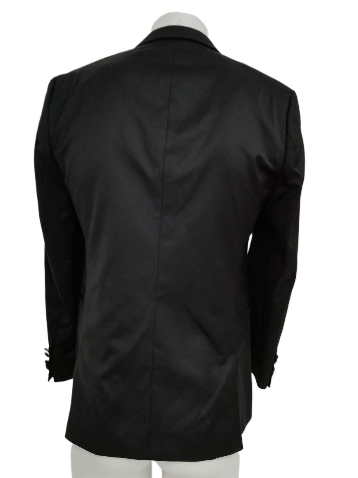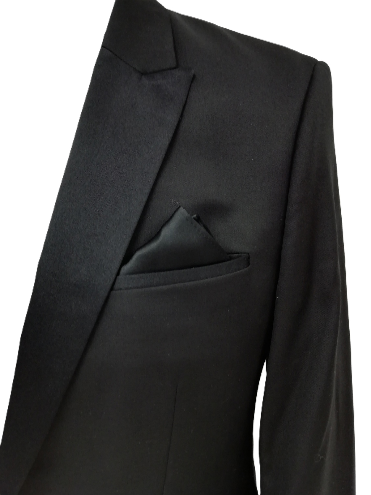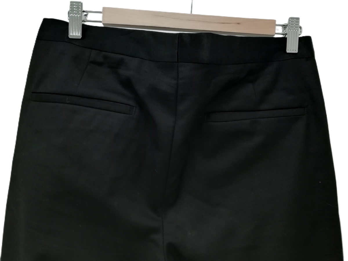The single-breasted jacket, sized UK 38R, is designed with a notched lapel, two-button fastening, and multiple pockets, exuding classic style. The trousers, sized 34L, feature a straight-leg design with a zip-and-hook closure, offering a polished and comfortable fit. The black colour ensures versatility, making it an ideal choice for various formal and semi-formal events.