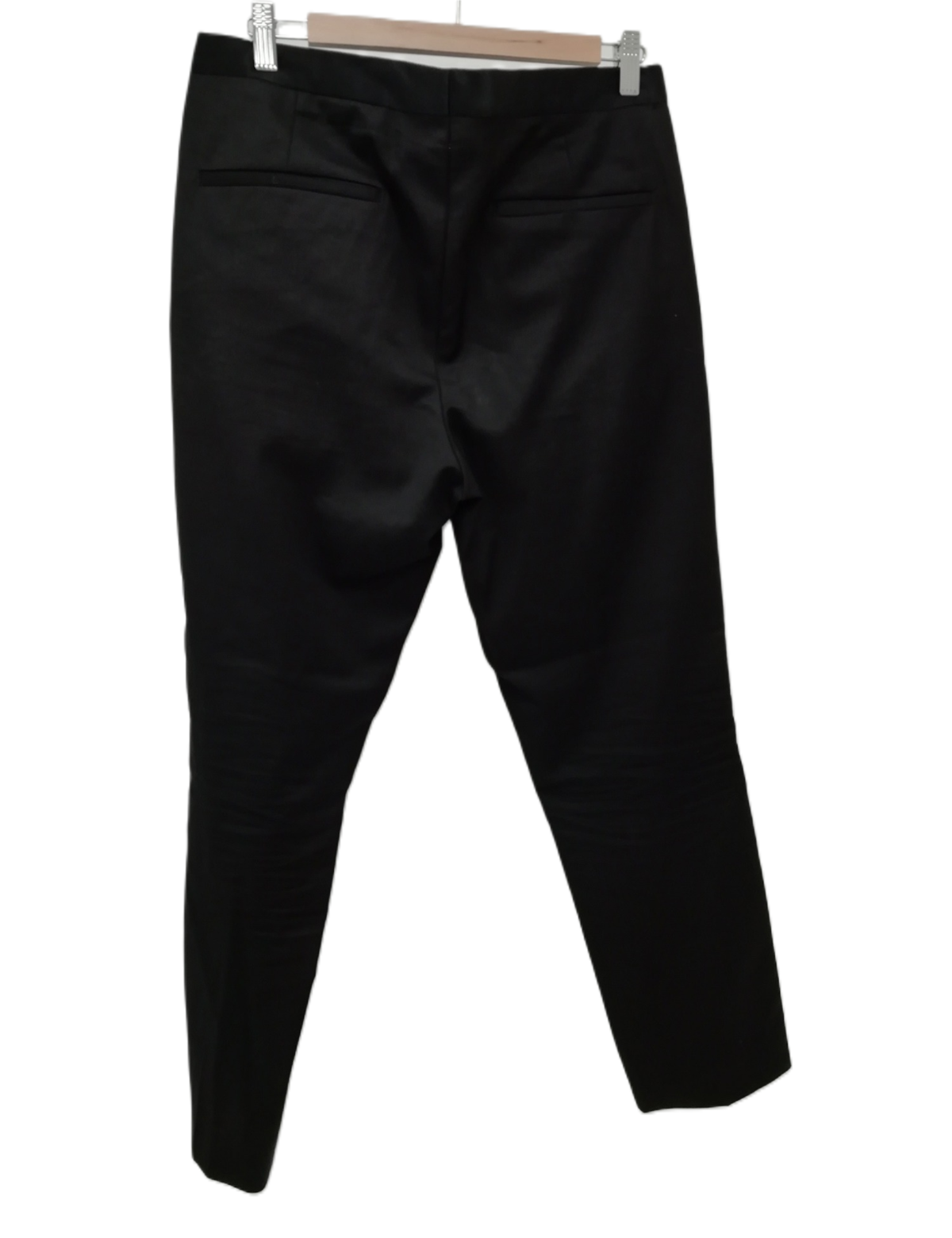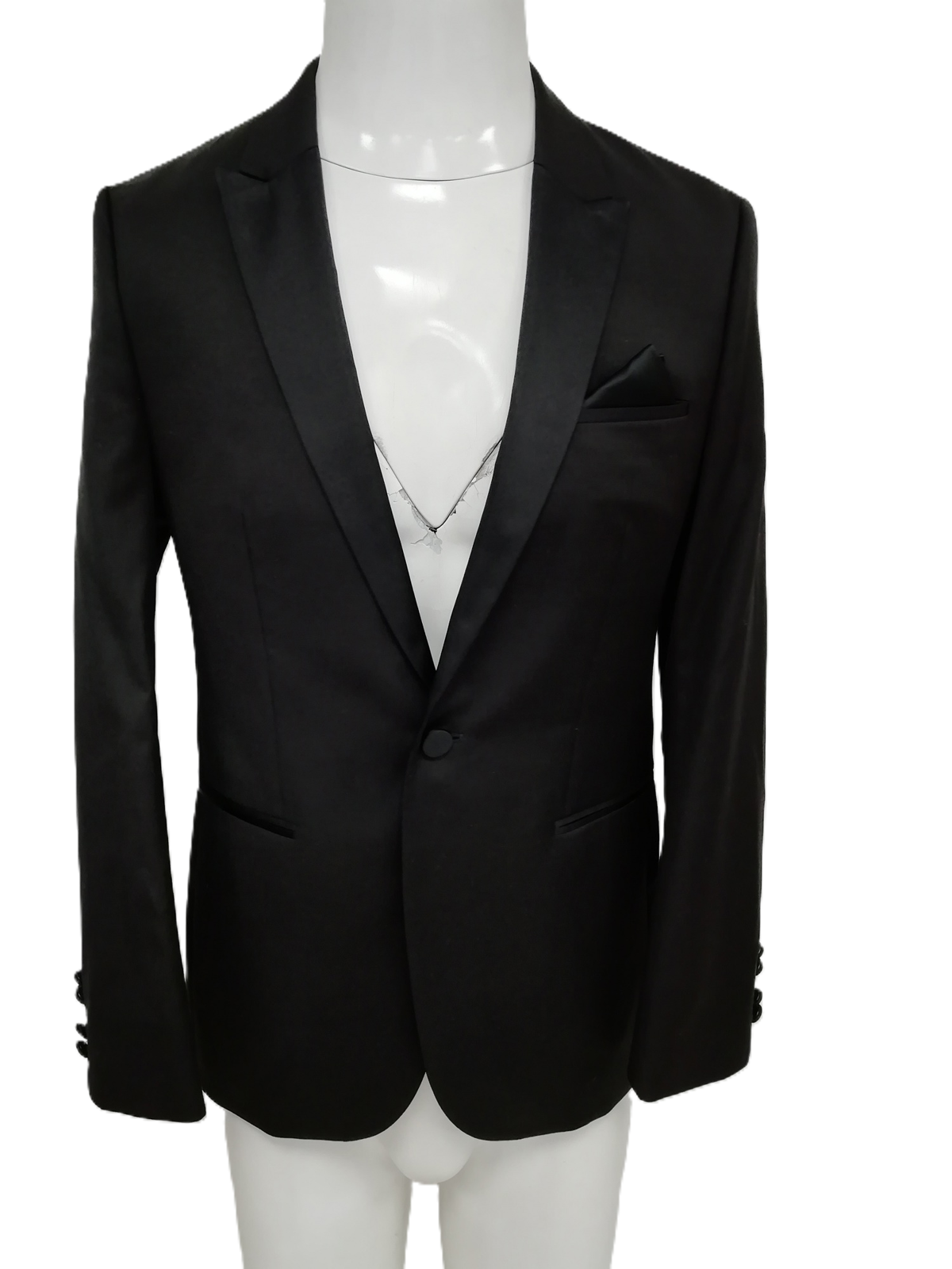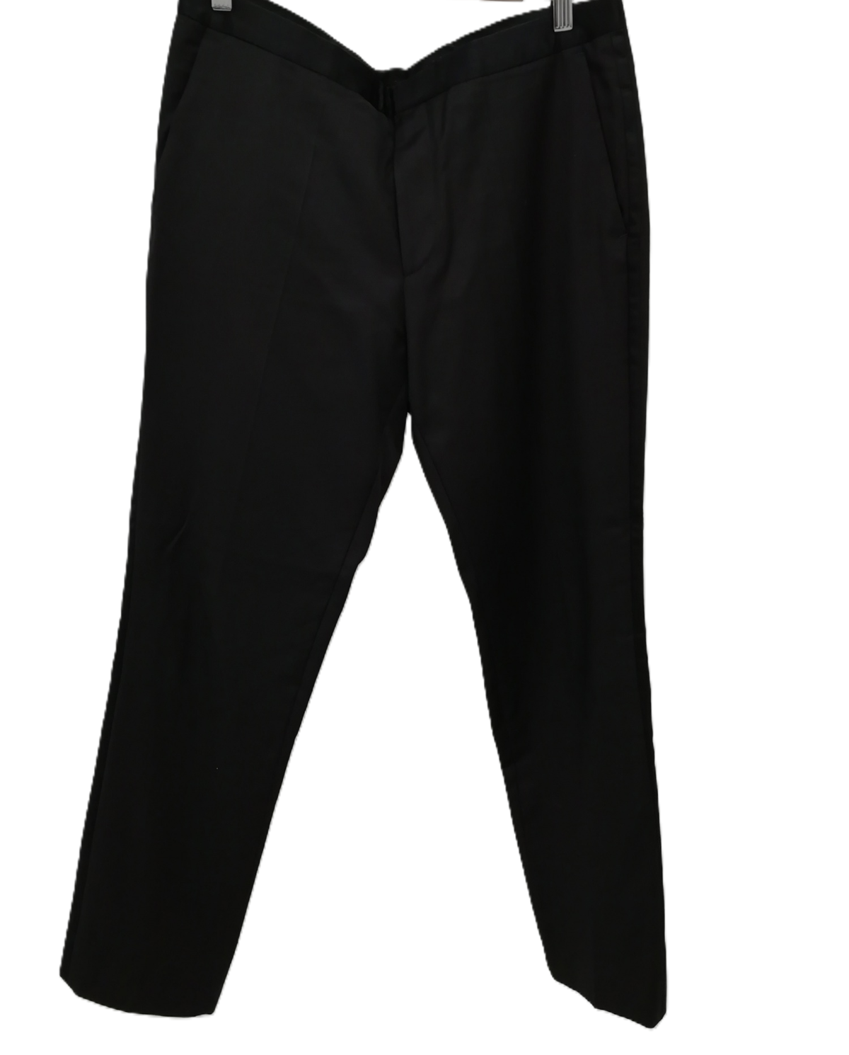 The single-breasted jacket, sized UK 38R, is designed with a notched lapel, two-button fastening, and multiple pockets, exuding classic style. The trousers, sized 34L, feature a straight-leg design with a zip-and-hook closure, offering a polished and comfortable fit. The black colour ensures versatility, making it an ideal choice for various formal and semi-formal events.