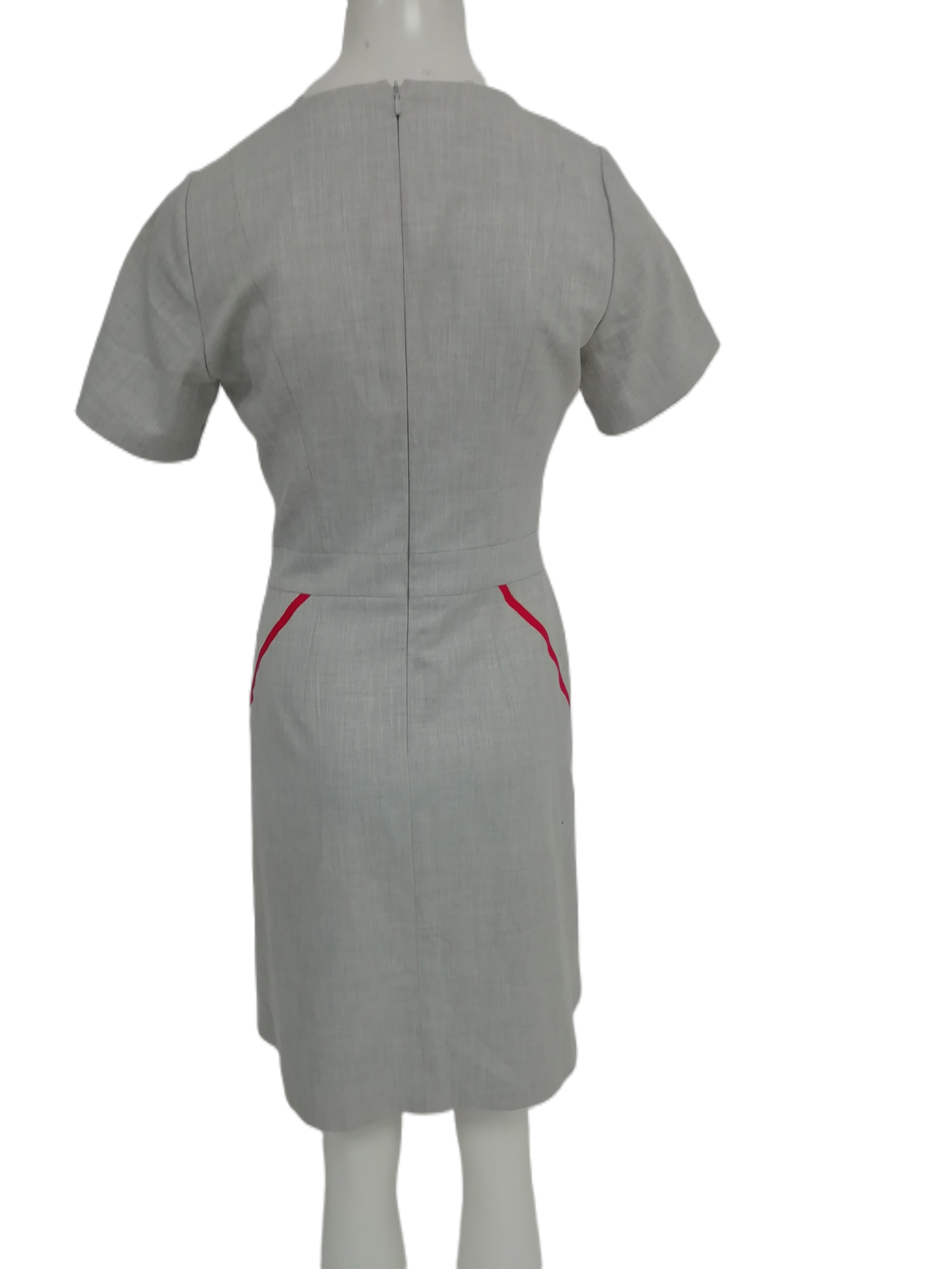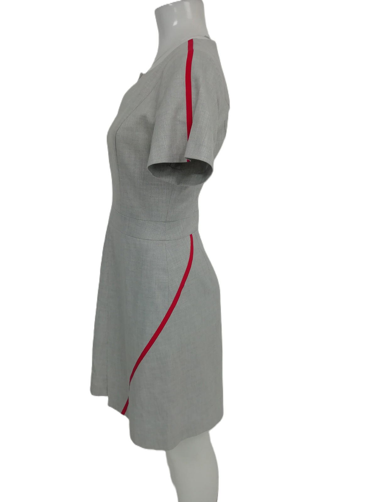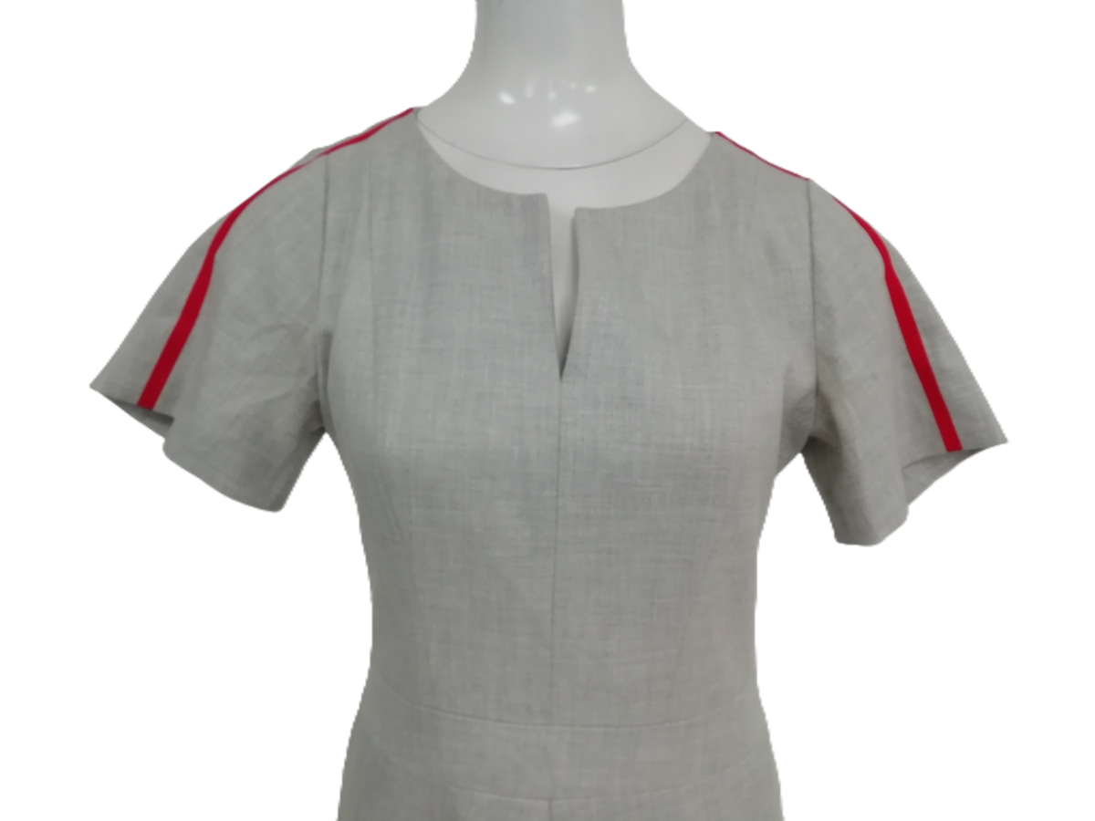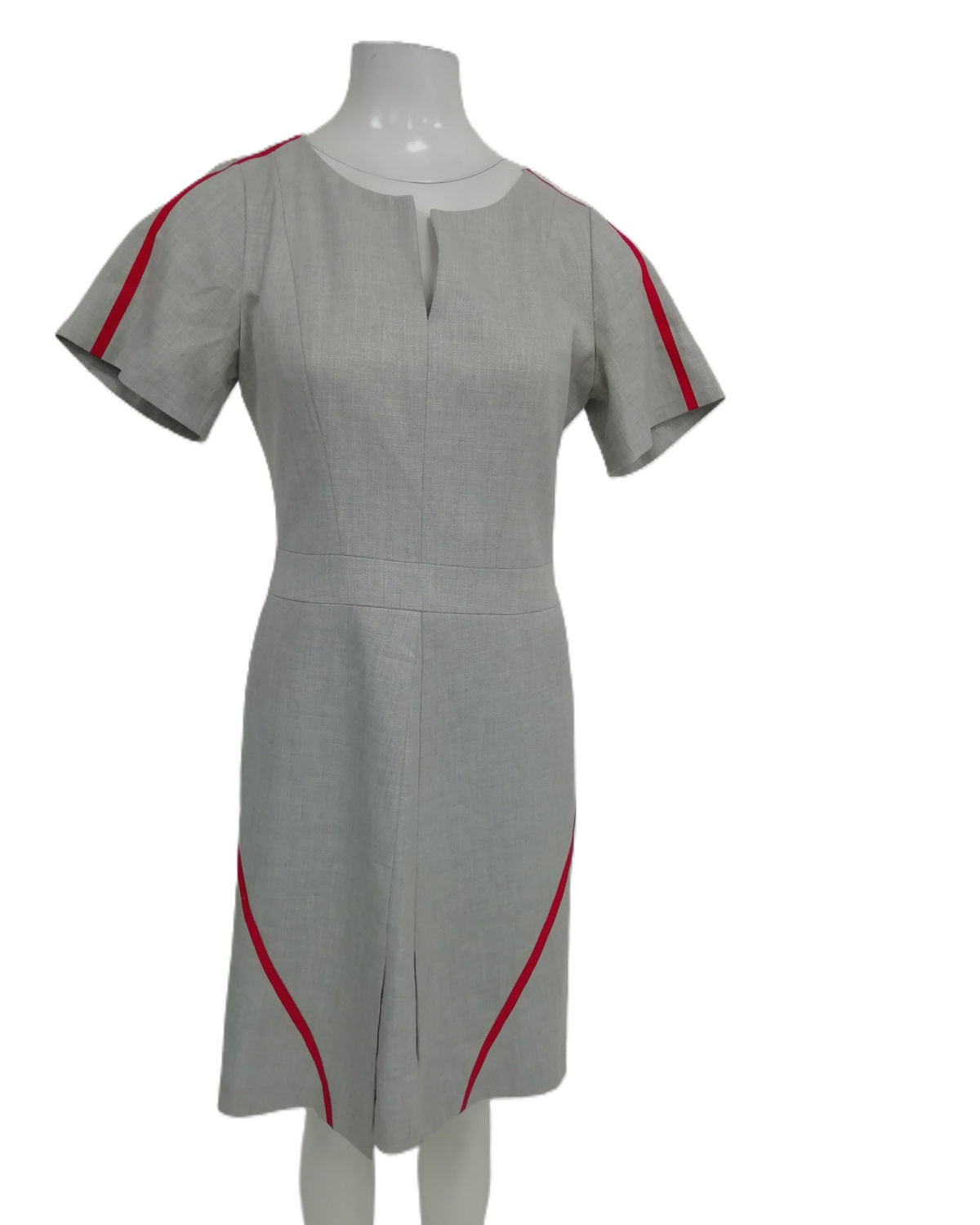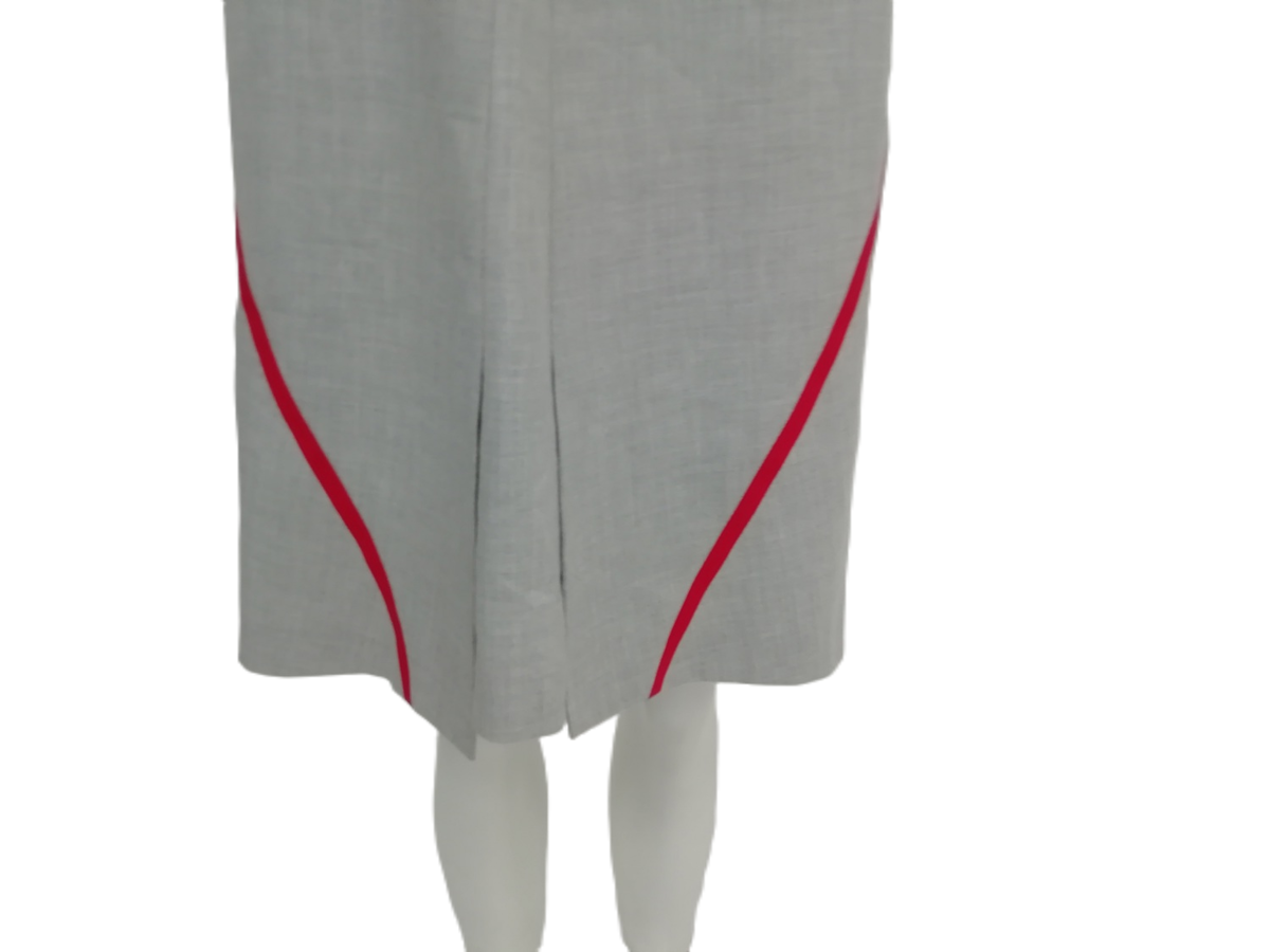 This sheath-style dress features a tailored silhouette that flatters the figure, perfect for creating a refined and elegant appearance. The classic grey base is accentuated with striking red accents, adding a bold yet tasteful contrast. With its knee-length design and sleeveless cut, this dress is ideal for office wear, business events, or smart casual outings.
