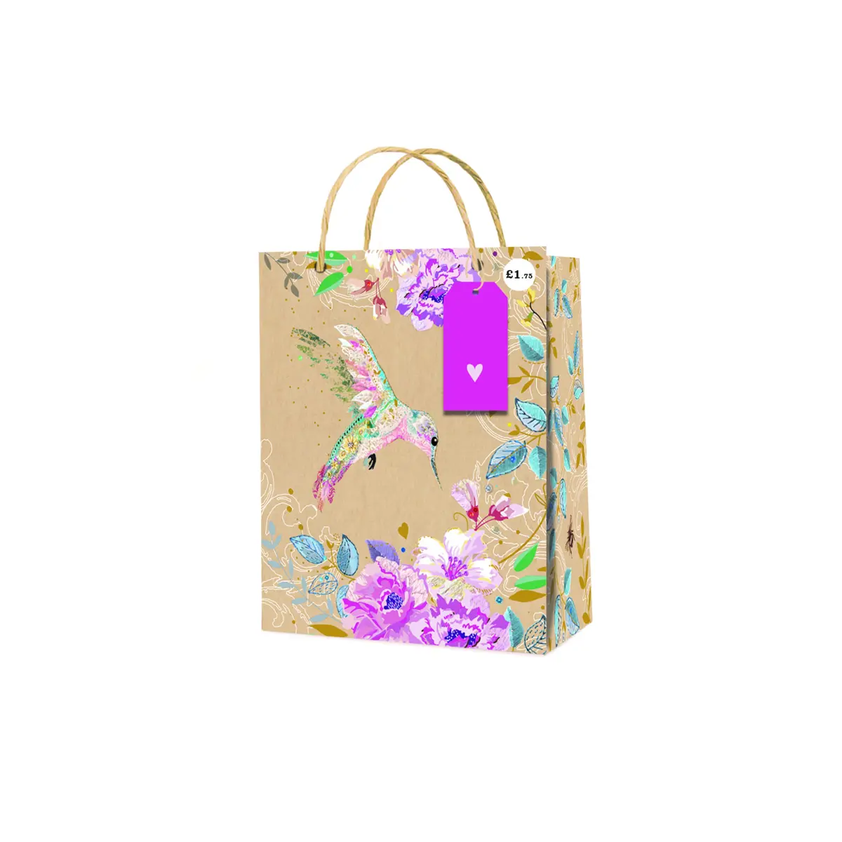 A brown gift bag that features a collection of delicately coloured hummingbird the front.