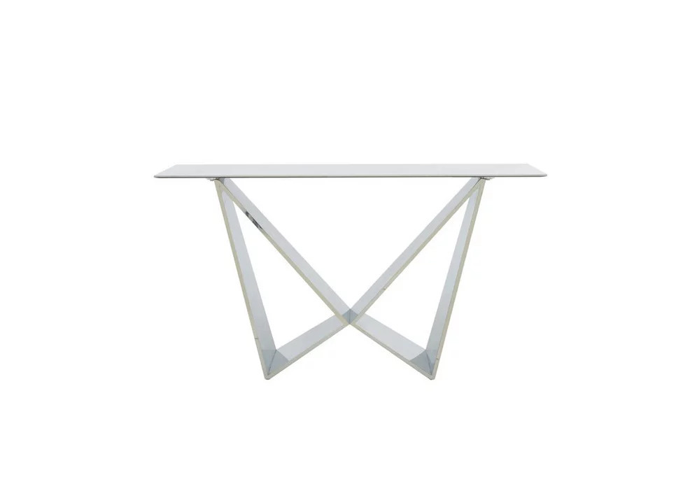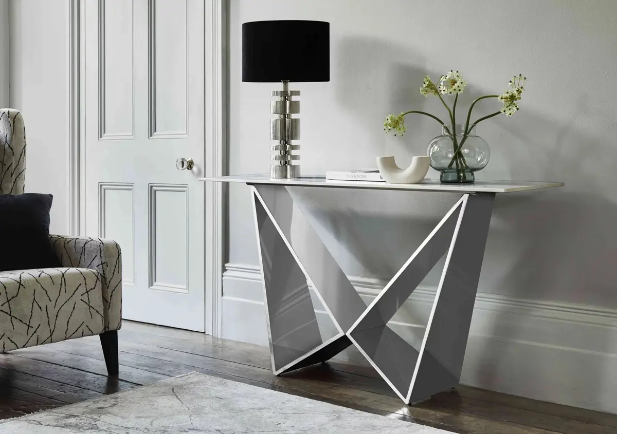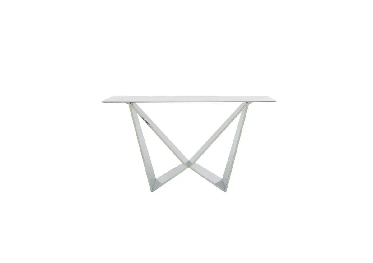 Bring a touch of modern glamour to your home with the Indus Valley Marvel Chrome Console Table. With its striking angular chrome-effect base and glossy marbled ceramic top, this showstopping piece adds instant sophistication and style to any hallway, living room, or dining space.