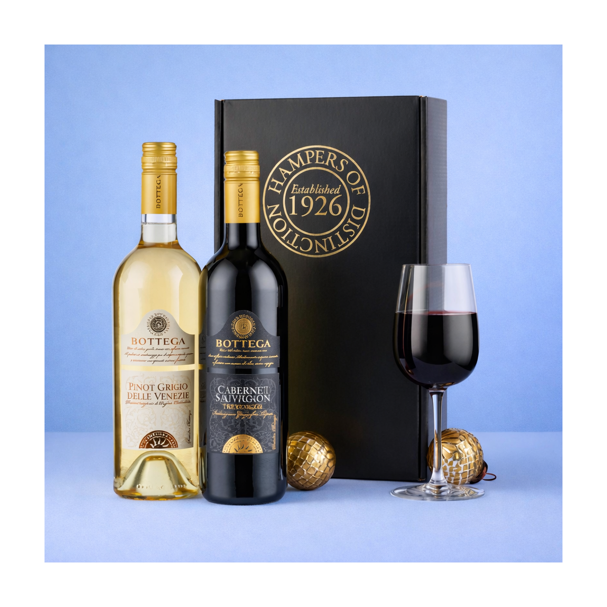 Italian Bottega Red And White Wine Gift Set – a sophisticated duo bringing together two of Italy’s finest flavours. The bold, velvety notes of Bottega Cabernet Sauvignon perfectly complement the crisp, refreshing character of Bottega Pinot Grigio, creating a balanced pairing ideal for any celebration or quiet evening in. Beautifully presented in a sleek black gift box, it’s a tasteful gift for wine lovers and a stylish addition to any table.