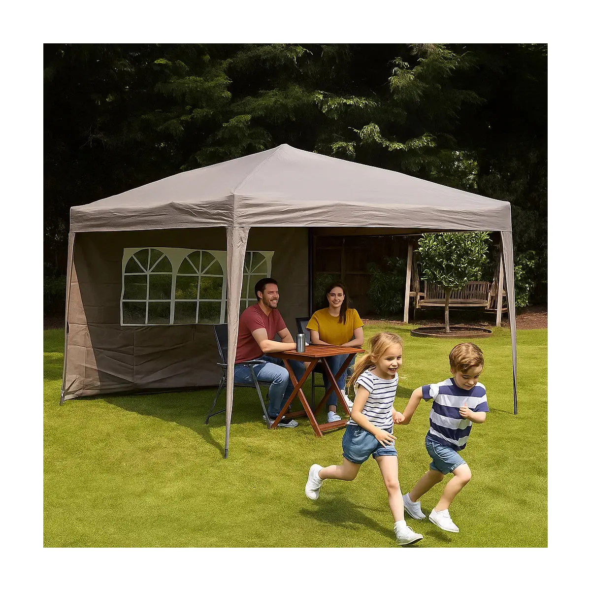 Crafted with 100% aluminium construction, this gazebo is completely rust-free, ensuring long-lasting durability. The easy-up design allows for quick assembly, so you can enjoy the outdoors with minimal effort. Whether you want to embrace the sunshine or seek protection from an unexpected shower, the included side curtain offers flexible coverage to suit all weather conditions.