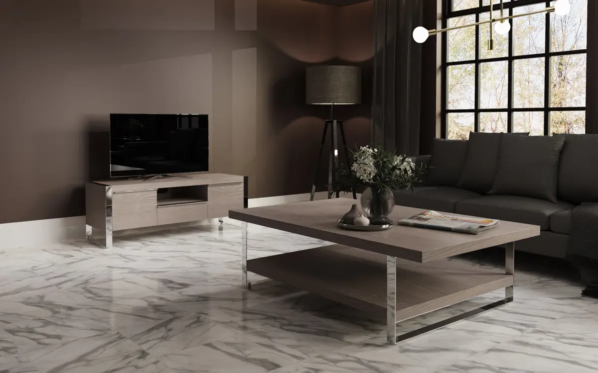 Introducing the Kettle Interiors Silver Oak and Chrome Large Coffee Table, a stunning centrepiece for your living room.