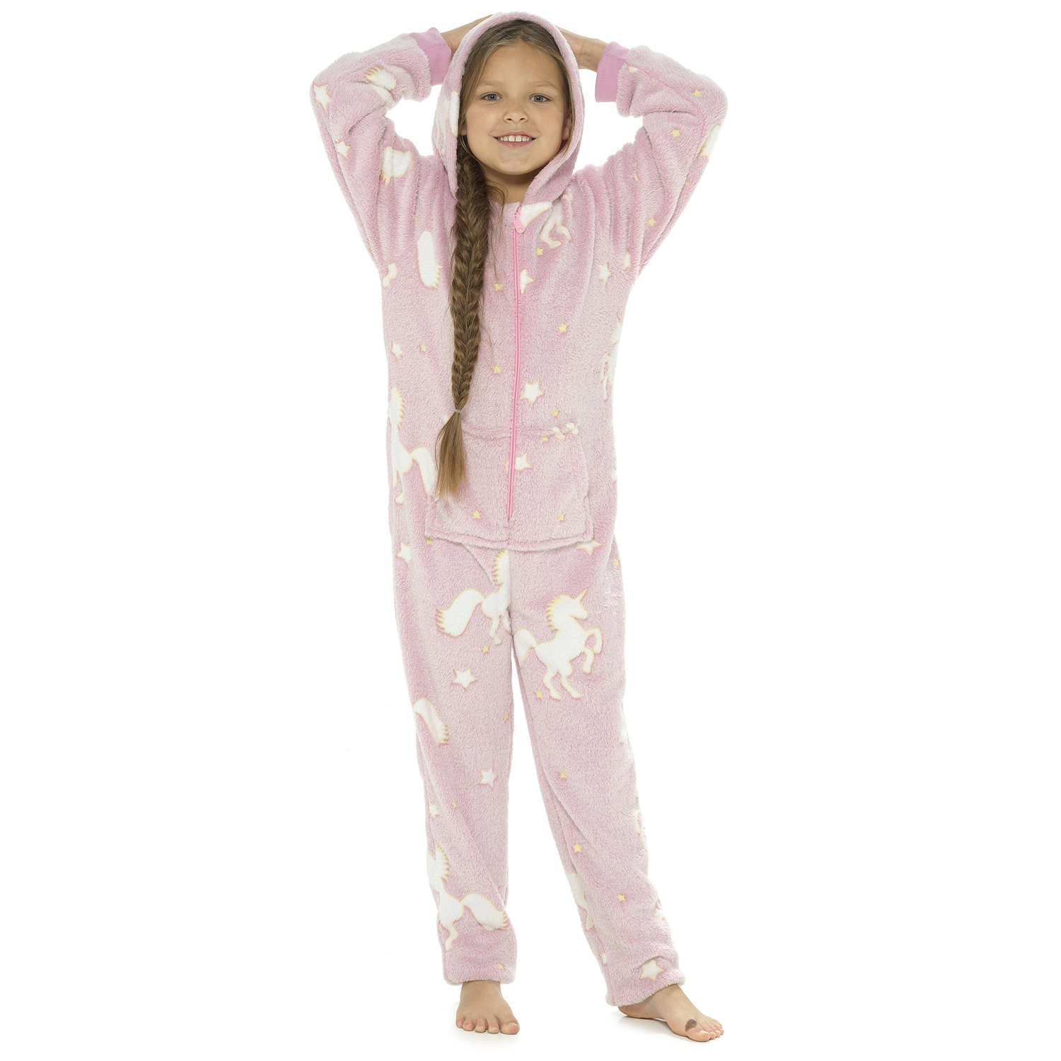Drift off to dreamland in style with our kids glow in the dark unicorn onesie. Available in 5 sizes, this adventurous all-in-one will keep your little one as snug as a bug as they settle down to sleep. Perfect for sofa snuggles or bedtime lounging, the onesie is made from ultra-soft plush pink fabric for added comfort and comes with an easy-access zip fastening front. As well as a bold unicorn design visible in the day, your child can also enjoy the glowing feature too – great if they’re afraid of the dark. Machine washable