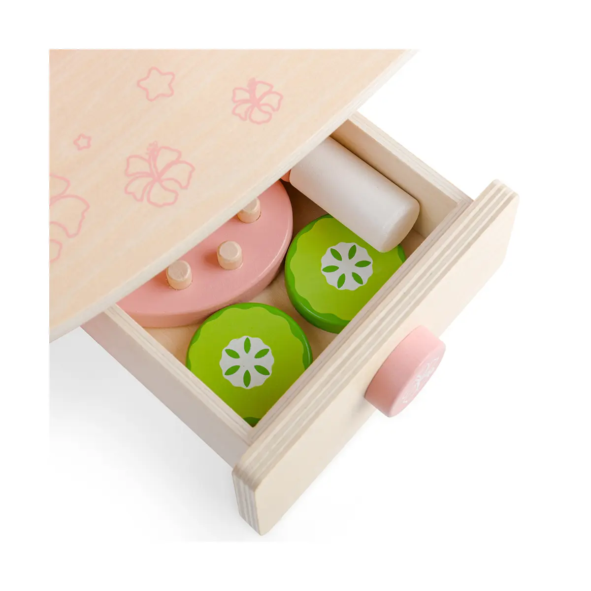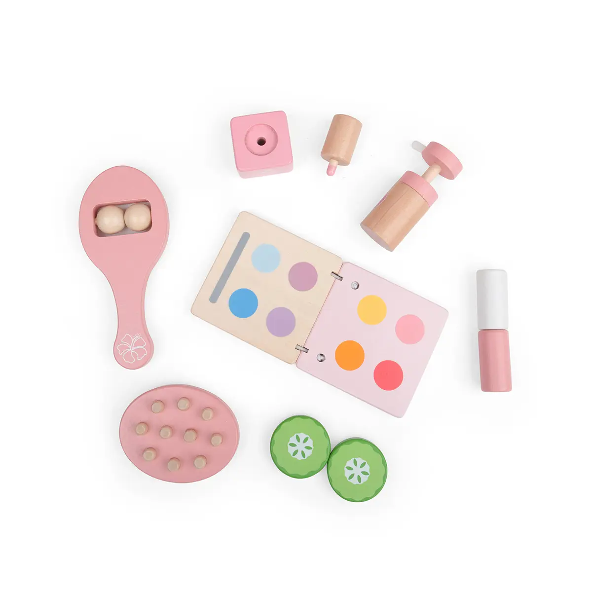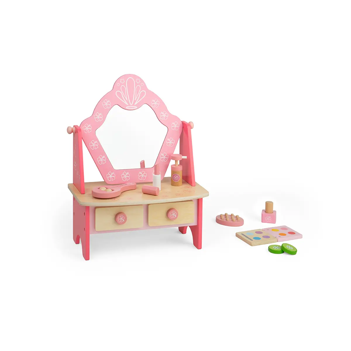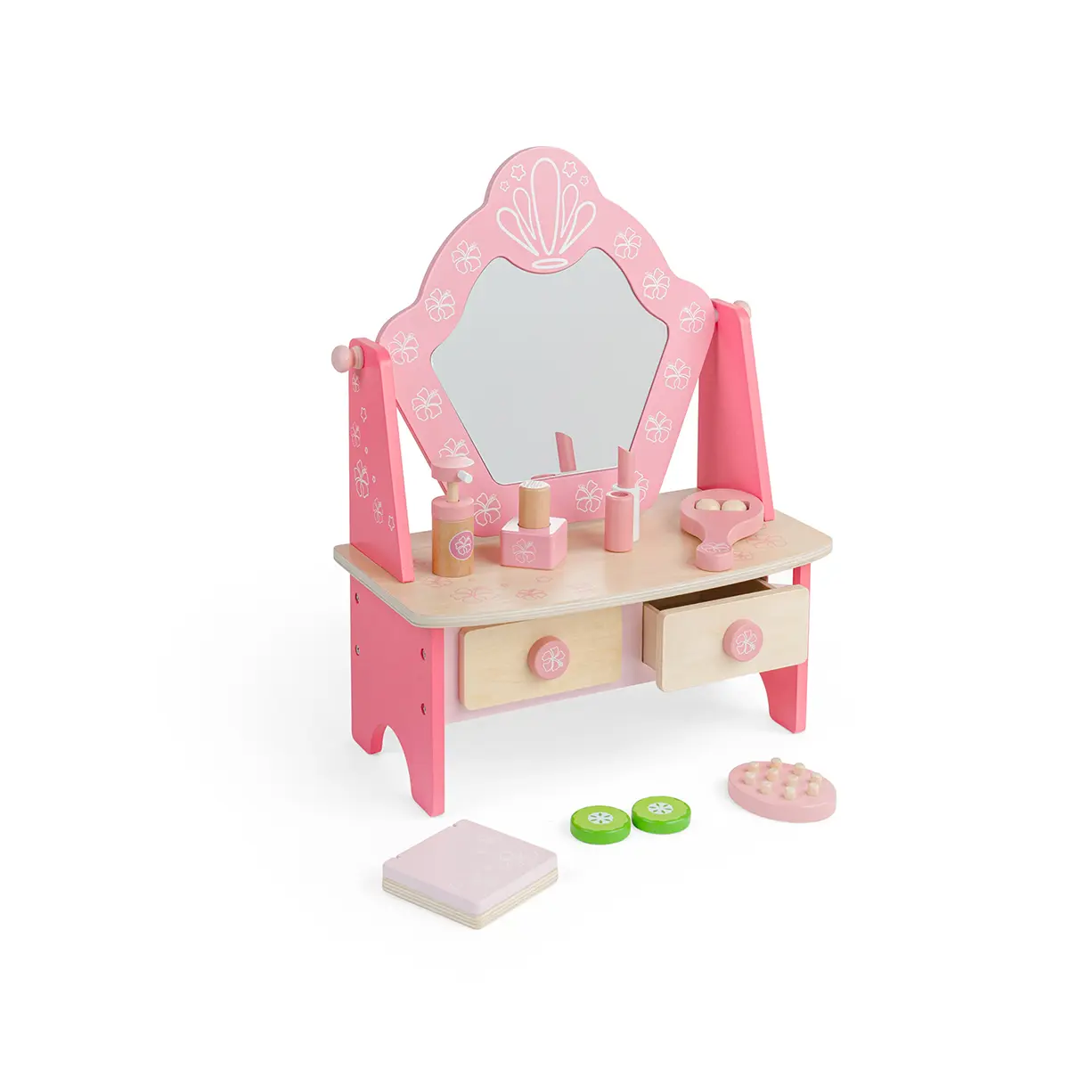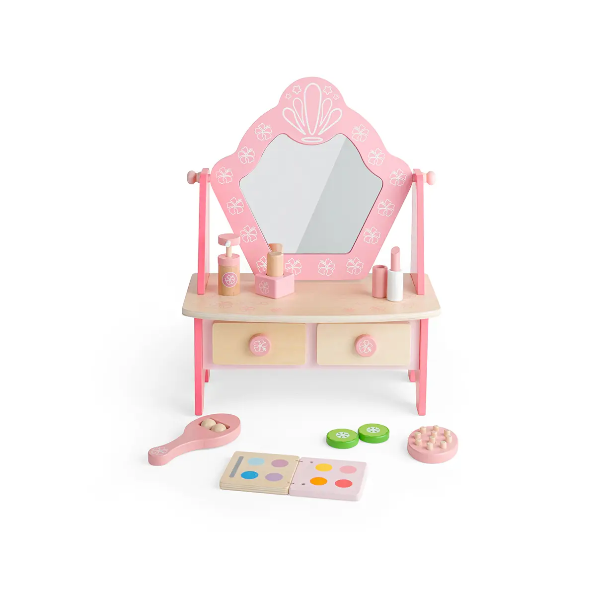 Mirror, mirror, on the wall, who’s the fairest of them all? Our pretty pink Kids Wooden Vanity Table & Spa Unit is the perfect excuse for youngsters to indulge in some pretend pampering and make up skills. Designed with hours of imaginative play in mind, our children’s wooden vanity table comes with a vanity unit with two drawers and a mirror plus a wooden makeup compact, cucumber slice, face roller, hairbrush, lipstick, perfume and nail polish. Painted in delightful pink shades with hibiscus flowers. A beautiful addition to bedrooms, playrooms or nurseries. Suitable for 3 years +. Made from high quality, responsibly sourced materials. Vanity Spa Unit - product features: Kids wooden vanity table with a mirror Ideal for imaginative pretend play 3 years + 33.9cm W x 42.3cm H x 18cm D