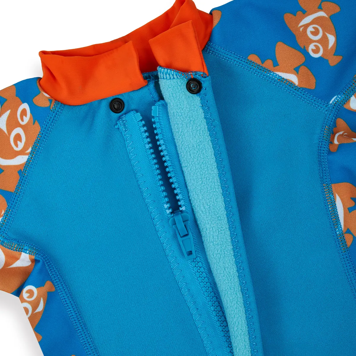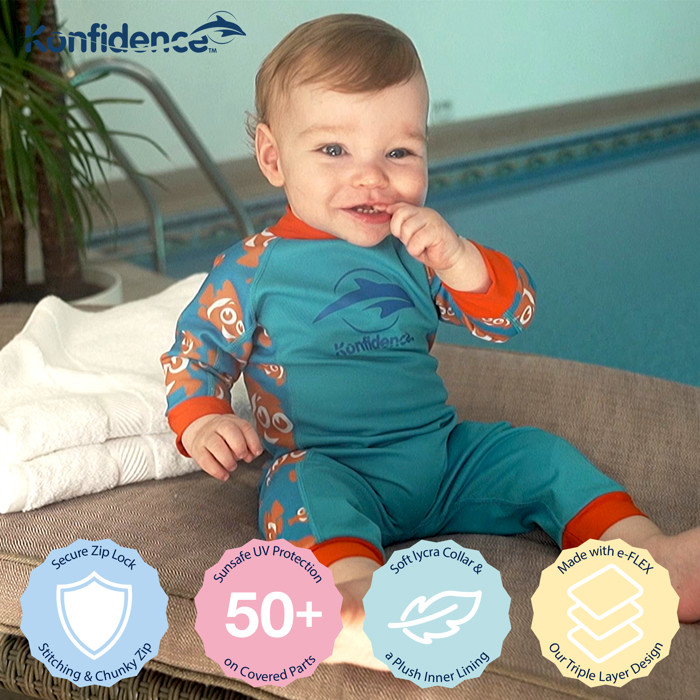Support your toddler’s water confidence with the Konfidence™ Splashy Swimsuit in the delightful clownfish cyan design. Featuring cheerful sea creature prints and a soft fleece lining, it’s perfect for keeping little ones warm as they play, splash and learn. From swim lessons to beach adventures, this suit provides both comfort and reassurance.